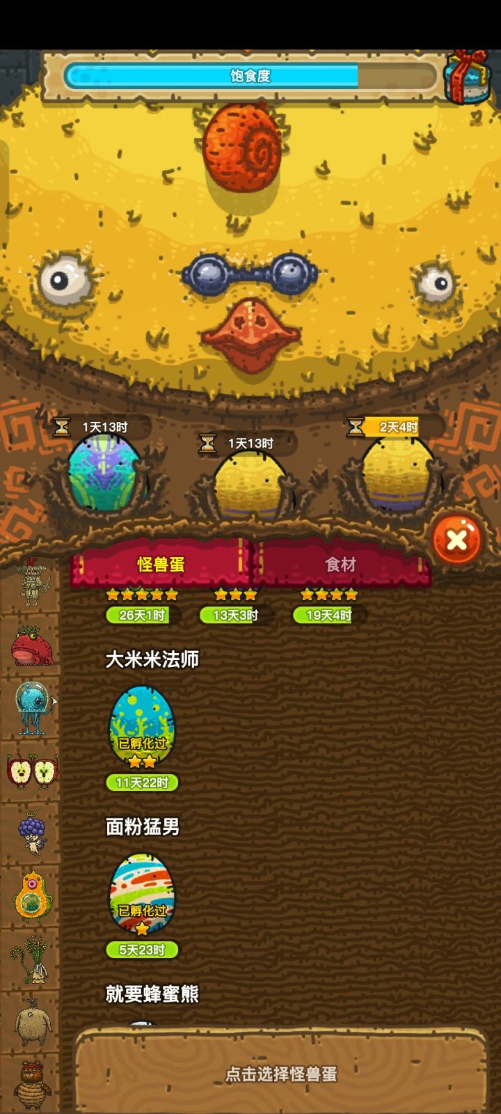 能不能添加一个功能,花费一点金币,将已孵化过的,重复探险得到的怪兽蛋变成标本,永久保存,然后再据此添加一些成就。不花费金币那就过期变成蛋魂。毕竟是个收集养成游戏,这样可玩性也会高一点,喂食大黄鸡太亏了,爆率不高,而且怪兽蛋的花纹也很好看啊。想保存下来