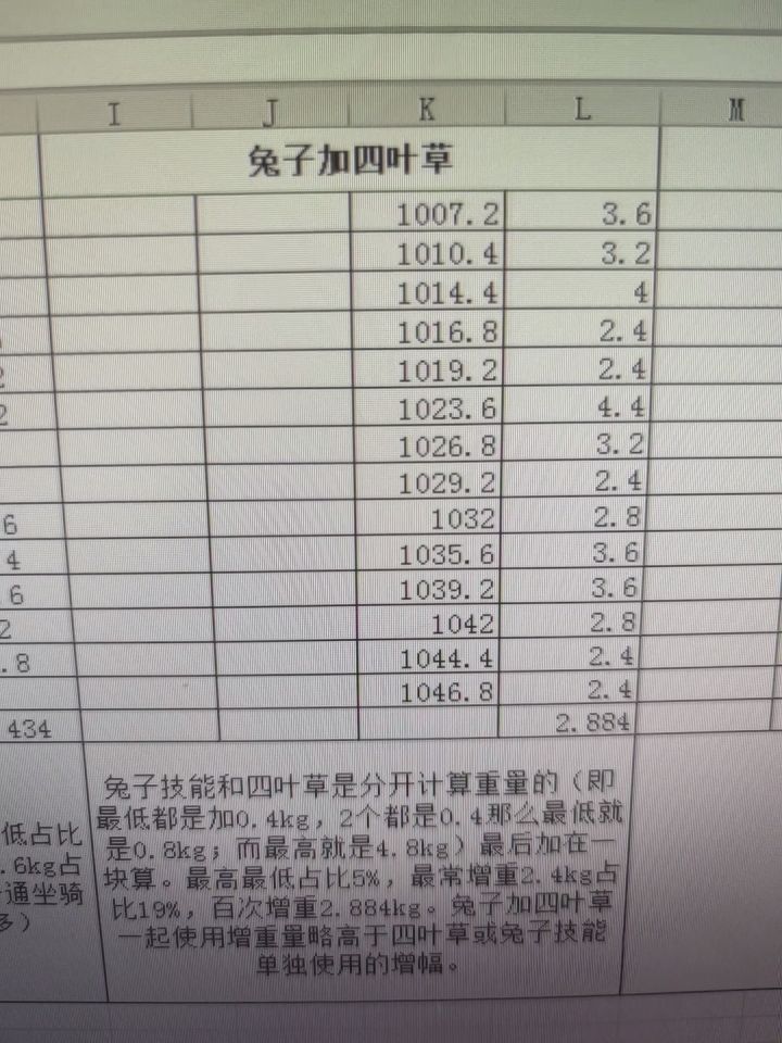 经过研究发现,兔子技能和四叶草是分开计算重量的最后加在一块算(即技能和四叶草最低都是加0.4kg,2个都是0.4那么最低就是0.8kg;而最高就是4.8kg。增重范围还都是0.4kg的倍数,0.8kg,1.2kg,1.6kg,2kg,2.4kg,2.8kg,3.2kg,3.6kg,4kg,4.4kg,4.8kg)。最高最低占比5%,最常增重2.4kg占比19%,百次增重2.884kg。兔子加四叶草