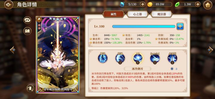给入坑的新萌介绍下常驻池必练的输出天花板之一青年威尔海姆,在之前还没有改的时候剑鬼的2技能需要在每一刀都触发打倒对面任意人数才能触发下一刀的连击最多是可以连三刀,其他技能是不变的,所以在没改版之前还得计算敌对血量来提高输出,虽然伤害高但是还是有点麻烦的,现在改版后不管有没有打倒都可以挥三刀,而且还增加了伤害,如果在连击期间其中一段击倒了敌对任意人数伤害可以增加50%/人,技能描述有截图,一技能就是普通的伤害其他啥也没有,三技能的话可以加爆伤,必杀伤害也很客观但是就是打不死还得补个刀或者燃烧让他烧死。技能升级的话我是建议只要升级ap技能就行了,其他的没必要,主要靠AP输出,SP跟普攻基本是用不到的,到后面有个微精灵祝福,所以想要主练剑鬼的可以把必杀升满。好了下面就是剑鬼配图了