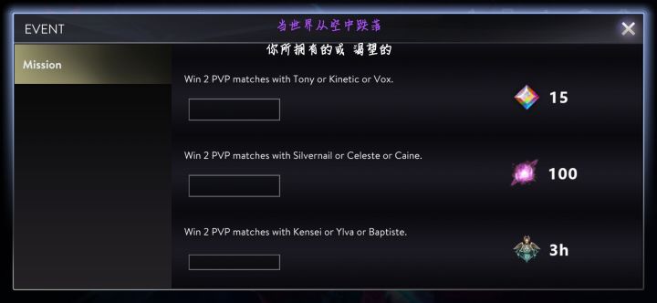 倒数第二个:用银钉/星乐斯/凯恩赢得两场pvp。最后一条:用剑圣/伊娃/巴蒂斯塔赢得两场pvp。