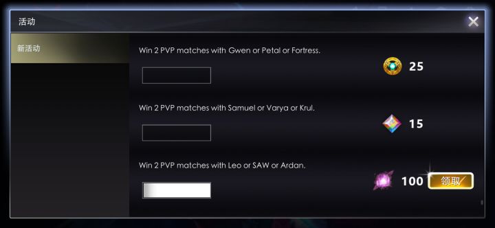 今天刚打开taptap,好几个说感谢的,仔细一看,是把老贴看成新贴了,为了不再麻烦,这里就把目前的新活动翻译一下〔9.14〕第一条:用格温,花花,魔狼赢得两场胜利第二条:萨米尔〔黑法〕,雷法,鬼剑第三条:里昂,索尔,二蛋