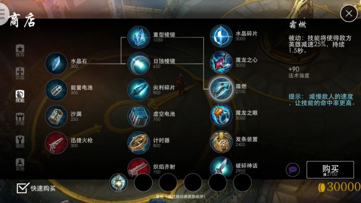 首先我们可以看到霜燃的描述是:技能使敌方英雄减速25%,持续1.5秒。持续用技能攻击敌方不会叠加效果,而是重新触发霜燃,霜燃没有CD,可无限使用。这里各位要注意的是:技能使敌方英雄减速而不是法术伤害。简单举个栗子,雷电公主的普攻是纯法伤,然而是无法触发霜燃的,因为是普攻,交流电也无法触发霜燃,同理,英雄的被动不算释放技能,也无法触发霜燃,比如沃克尔,只有当他勾住敌方的时候才会触发一次霜燃,之后的