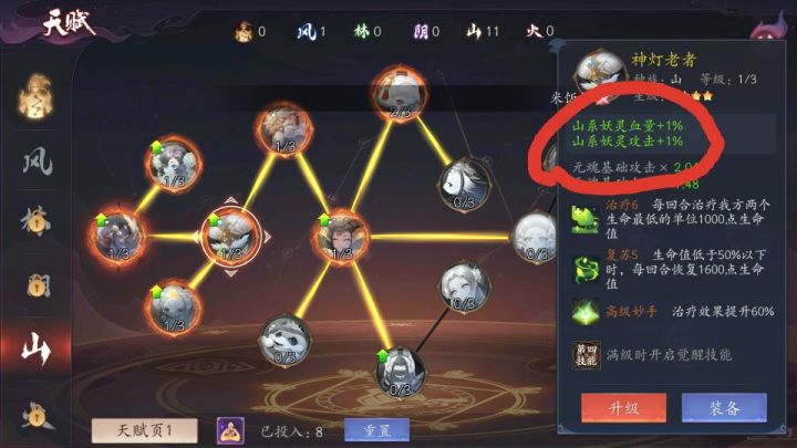 第一个问题是天赋种系加点, 比如说我山系技能树的每个头像绿字部分, 如果我全部点通但是不装备这个妖灵上场的山系其他山妖也会有这个绿字加成么? 还有第二个好感度点满的二维加成, 我如果点满灵芝那么我主角天赋装备了灵芝的话会有好感度加成么?第三个问题, 上面说了我是玩山系的, 但是对付阴系这个法宝不知道怎么办! 2点魂就能关我两回和小黑屋, 如果对上的是防守阴系直接是3打5了,且只要他们中间不用法