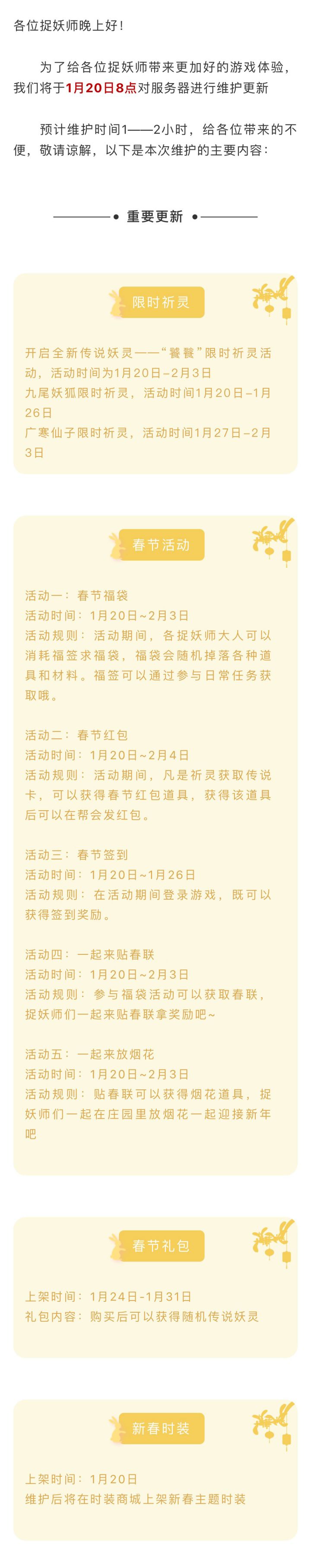 尊敬的捉妖师:为了给各位捉妖师带来更加好的游戏体验,我们将于1月9日8点对服务器进行维护更新,预计维护时间1——2小时,给各位带来的不便,敬请谅解,以下是本次维护的主要内容: ——重要更新——【限时祈灵】开启传说妖灵—“赤帝”与“白衣圣子”限时祈灵活动,活动时间为1月11日至1月18日【幻世纵横】1.新增幻世纵横称号2.新增赛季奖励结算和国家日志功能3.新增盟主功能及盟主特权功能