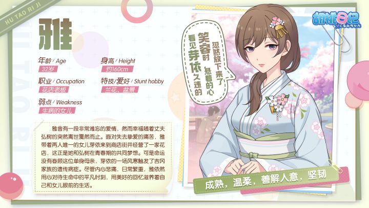 商店街花店的老板雅姐姐是胡桃最先熟悉的新朋友。温柔而善解人意的她给了“种田新手”的胡桃许多帮助。虽然雅姐姐平日里永远都带着一副甜美的笑容,但其实她的生活非常坎坷。面对这位天使一般的大姐姐,我们也一定会竭尽全力去帮她排忧解难的,对吧?