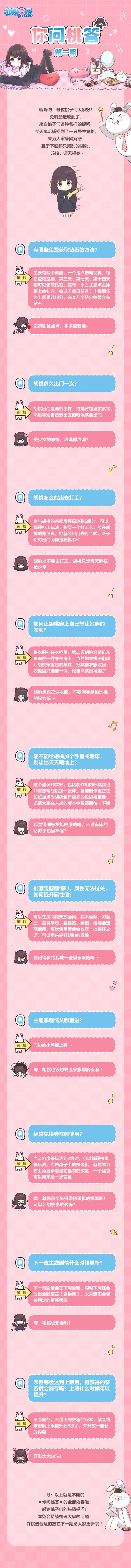 新剧情?小宠物?还记得前几天兔叽提到过的宠物——小桃吗?是的,本周四的主线剧情里,它就会正式登场啦! 看起来这么可爱的小桃,是邻居小光拜托胡桃和你一起照顾的哦,胡桃光听到这个消息就已经激动的不行了。照顾小狗狗有哪些需要注意的呢?准备牛肉干?(兔叽OS:不会是你想吃吧…)给狗狗洗澡?还要带狗狗打疫苗?究竟胡桃和临时寄养的狗狗小桃,会发生哪些奇妙的化学反应呢?(本兔碎碎念:感觉自己要失宠了T.T