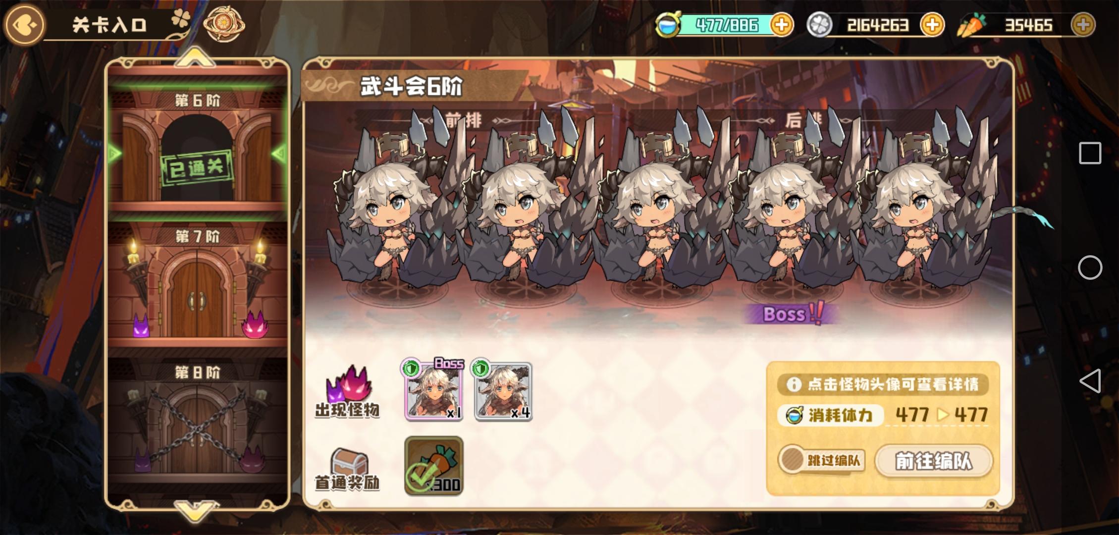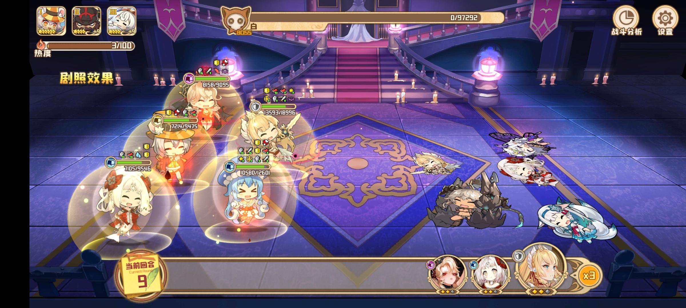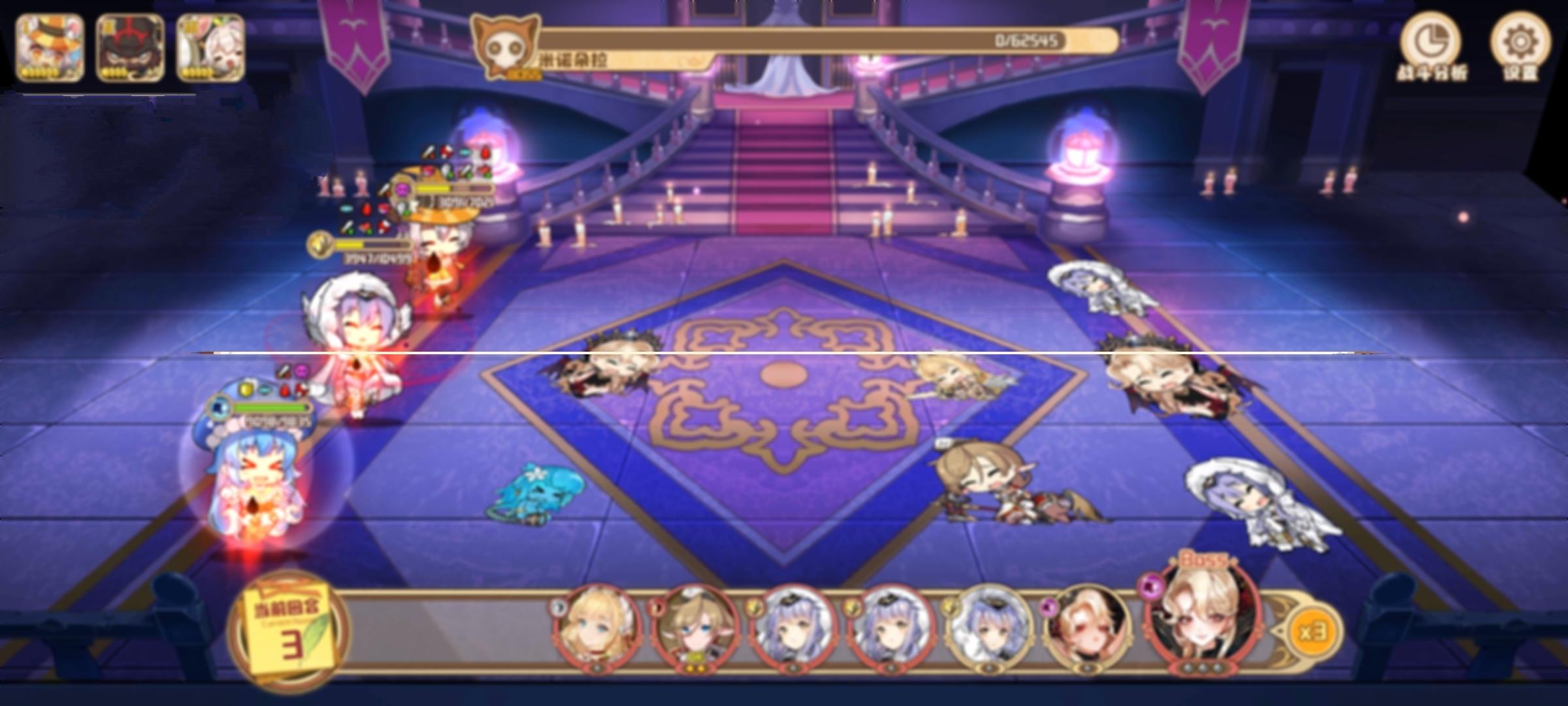 给还没过的小朋友们提供一些参考哈~在此以第七关为例进行分析。 五人组为双菇,妹妹,白和天使。站位如图。剧照搭配是不合理1+偷心9+拆礼物7(偷心9很重要!!!我偷心7打了很多次打不过,在刷偷心的同时也把蓝菇升到了6星 拆礼物个人觉得聊胜于无,只要还是开幕和高潮剧照)再来说说装备和宝石 天使用了t1+15。由于只有四星,所以我给了天使3蓝1绿的宝石,让血量在16000左右,能抗住