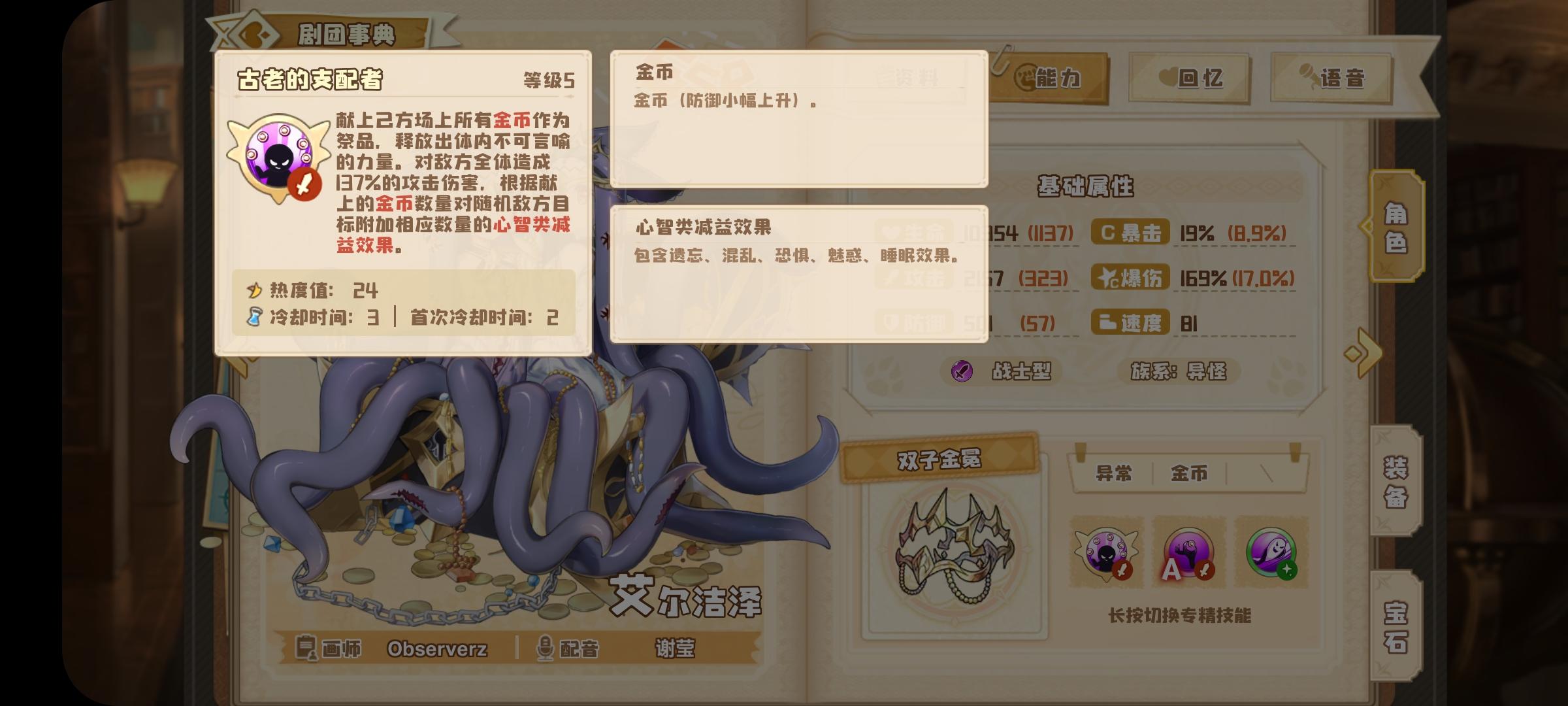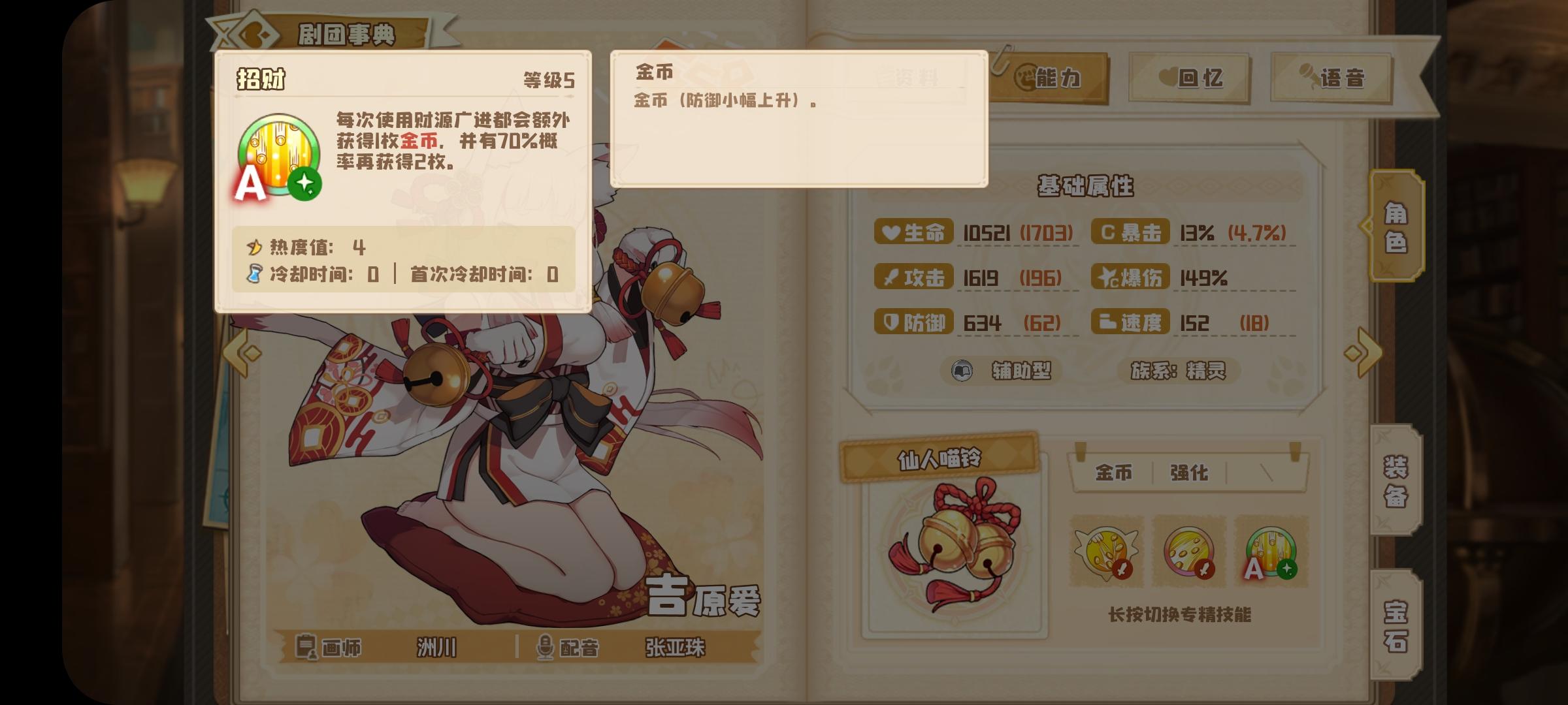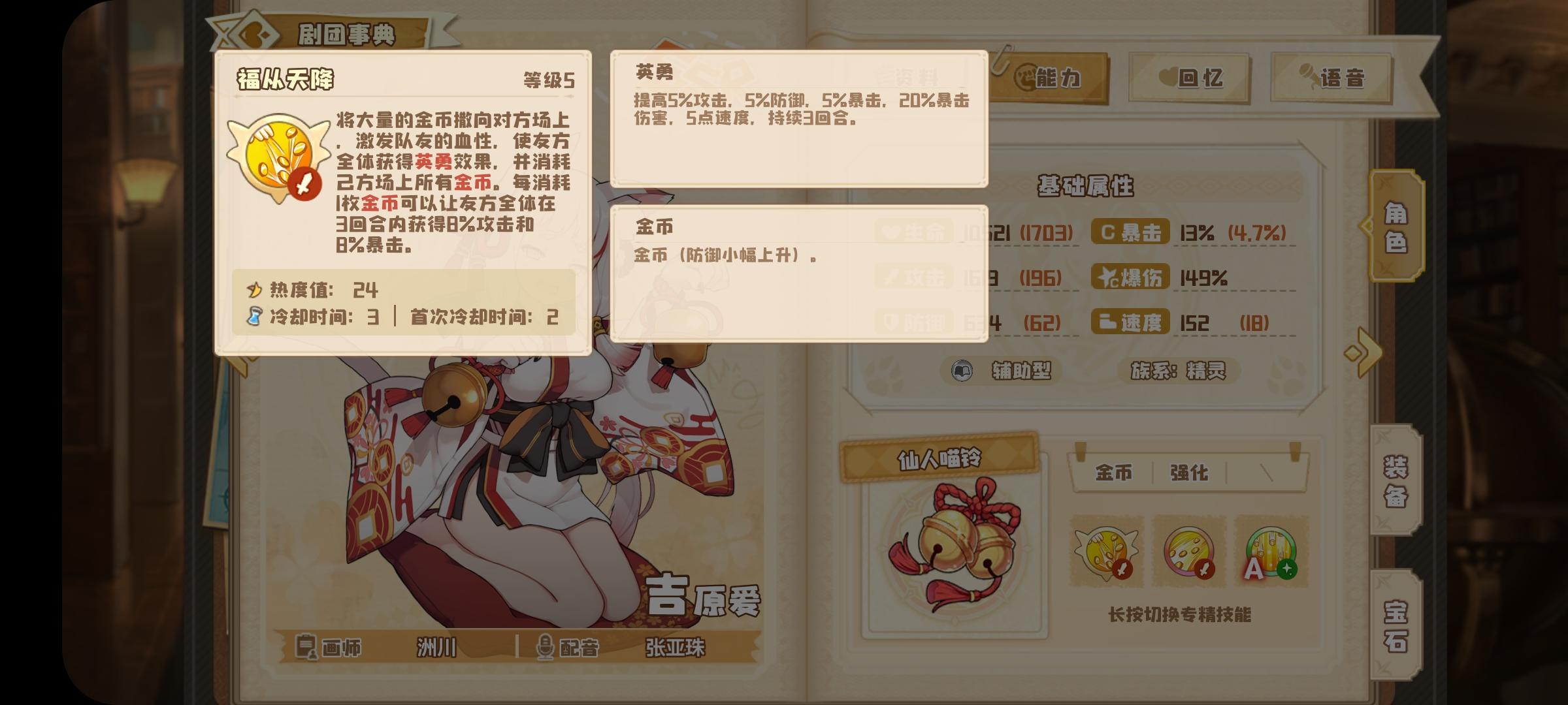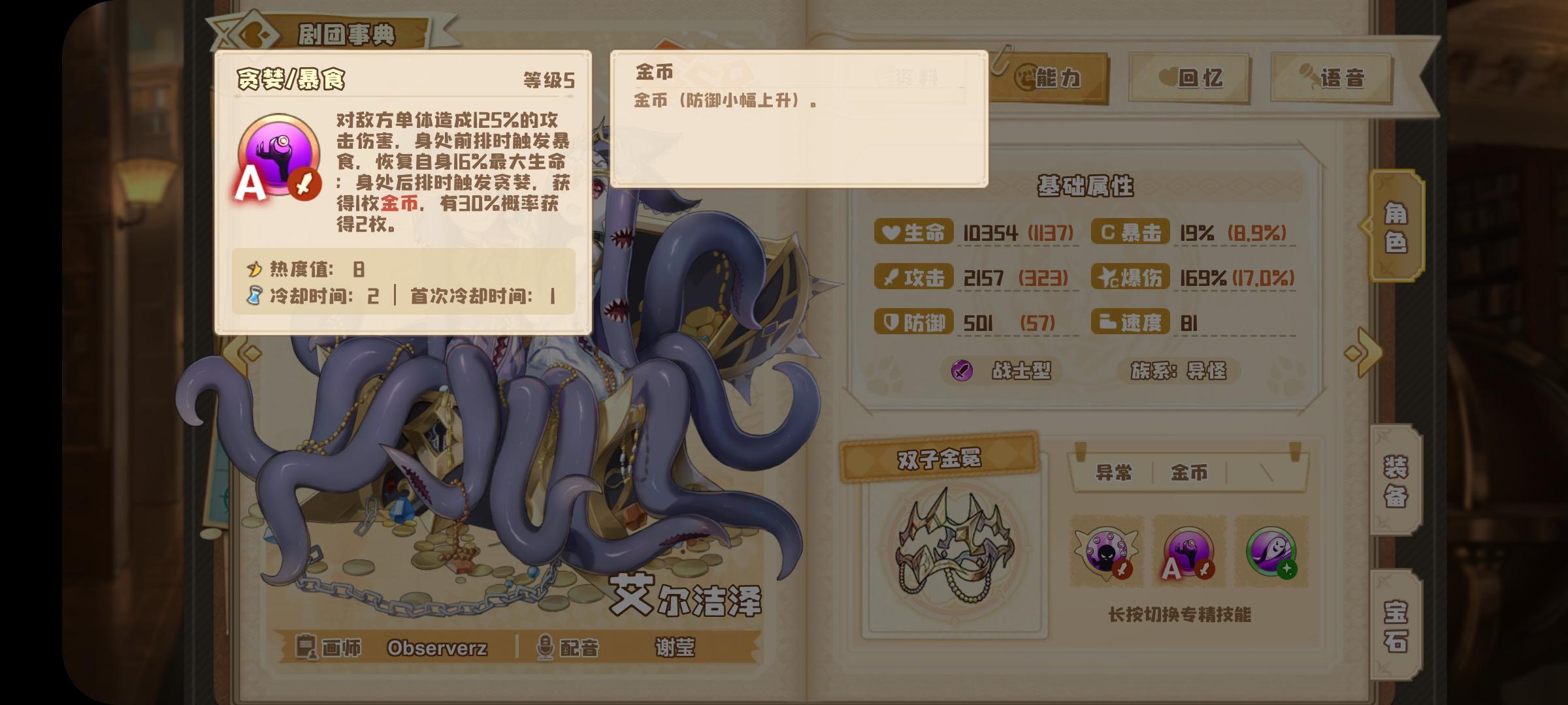 金币队伍理论可行体系携带不合理报酬1剧照偷心盗贼加2剧照3剧照随意,猫猫携带财源广进大概率一次攻击4金币,第三回合奥义的话猫猫大概率aa的出8金币,随后携带多萝西宝箱怪受到攻击概率获得金币然后双子的概率2金币来讲3回合在8-11金币之间,猫猫先拐双子后打输出随后依靠许多的buff效果来去敌方造成大量伤害,同时获得金币热量的偷心盗贼伤害也很高。