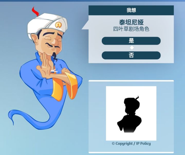 刚试了下用akinator猜艾丽卡和泰坦妮亚艾丽卡用了68个问题都没猜出来泰坦妮亚用了15个😎😎😎