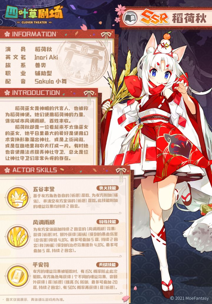 稀有度:SSR稻荷巫女是神明的代言人,也被称为稻荷神使。她们使用稻荷神的力量,保佑城市风调雨顺,百姓丰收。稻荷秋却是一位看起来不太像巫女的巫女,她平日里最大的爱好是使用幻术变换形象溜出神社,或是上街闲逛,或是在田地里和农夫打成一片。有时她也会使用法术捉弄神社守卫,总之是位让神社守卫们非常头疼的存在。