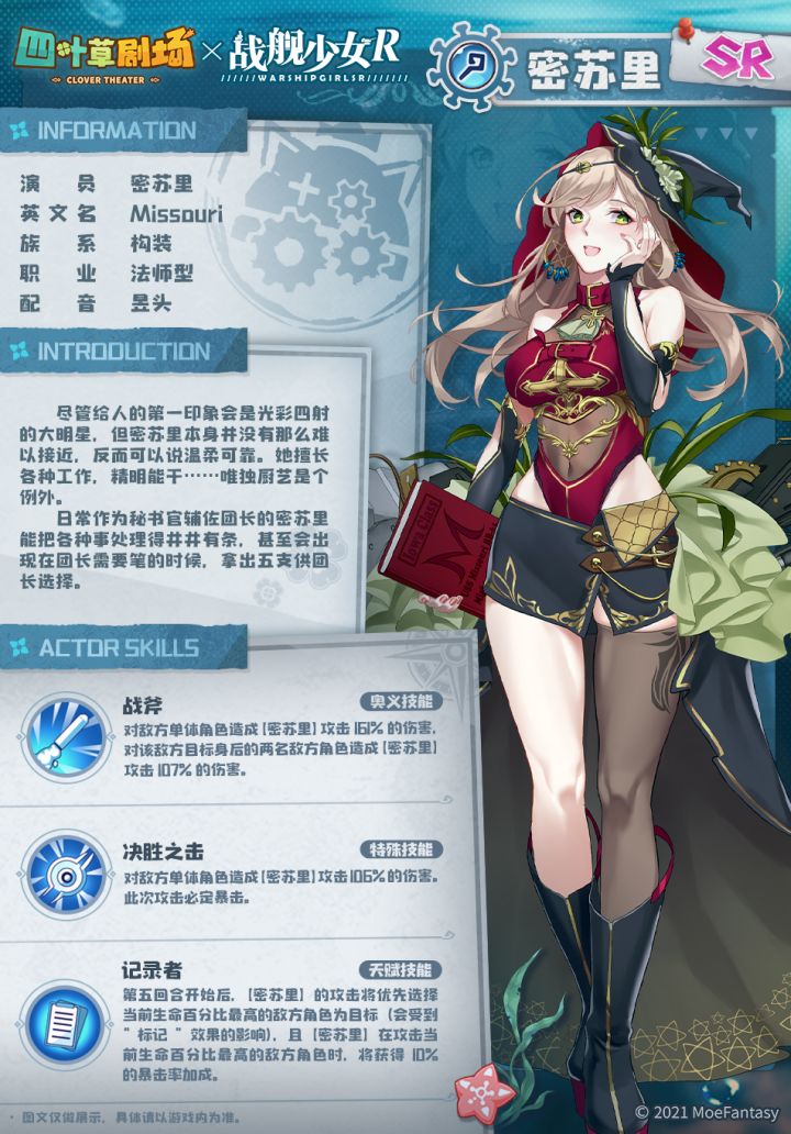 稀有度:SR尽管给人的第一印象会是光彩四射的大明星,但密苏里本身并没有那么难以接近,反而可以说温柔可靠。她擅长各种工作,精明能干……唯独厨艺是个例外。日常作为秘书官辅佐团长的密苏里能把各种事处理得井井有条,甚至会出现在团长需要笔的时候,拿出五支供团长选择。