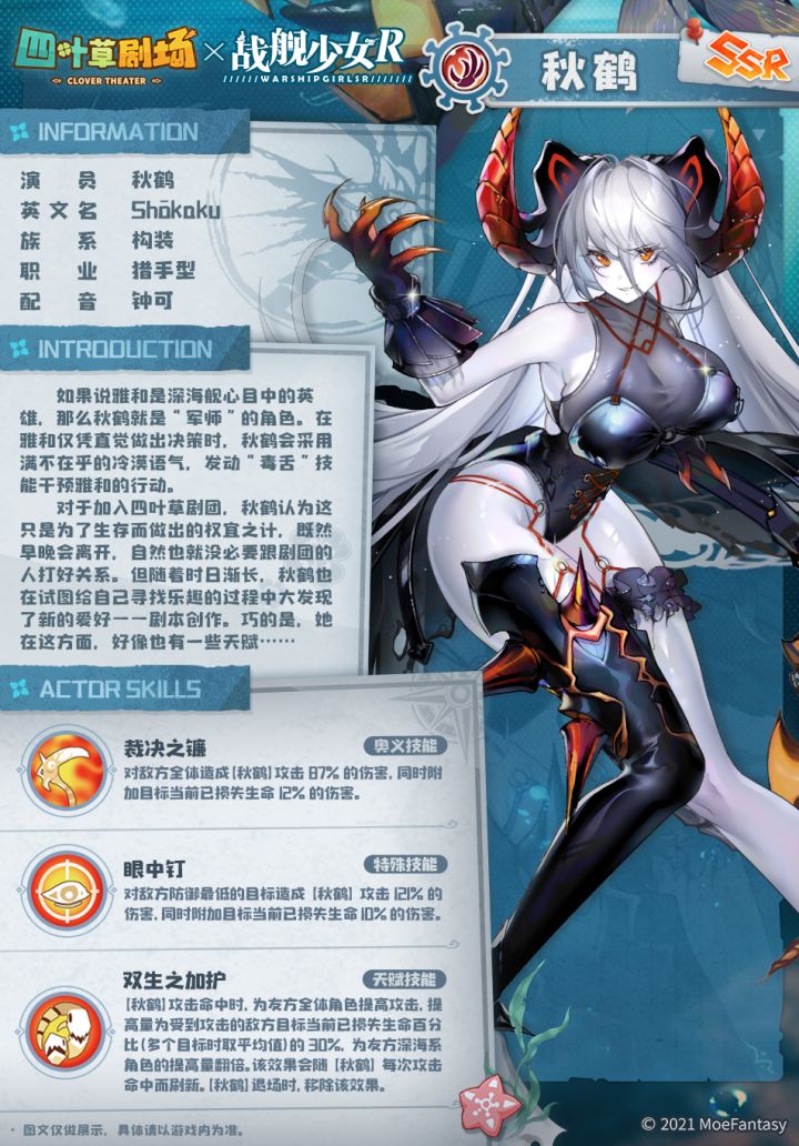 稀有度:SSR如果说雅和是深海舰心目中的英雄,那么秋鹤就在一定程度上扮演了“军师”的角色。当雅和仅凭直觉做出不靠谱的决策时,秋鹤会以满不在乎的冷漠语气,用挖苦和吐槽干预雅和的行动……虽然更多的时候她会选择看热闹。对于加入四叶草剧团这件事,秋鹤认为只是为了生存采取的权宜之计,既然早晚会离开,自然也就没必要跟剧团的人打好关系。但随着时日渐长,秋鹤也在试图给自己寻找乐趣的过程中发现了新的爱好……