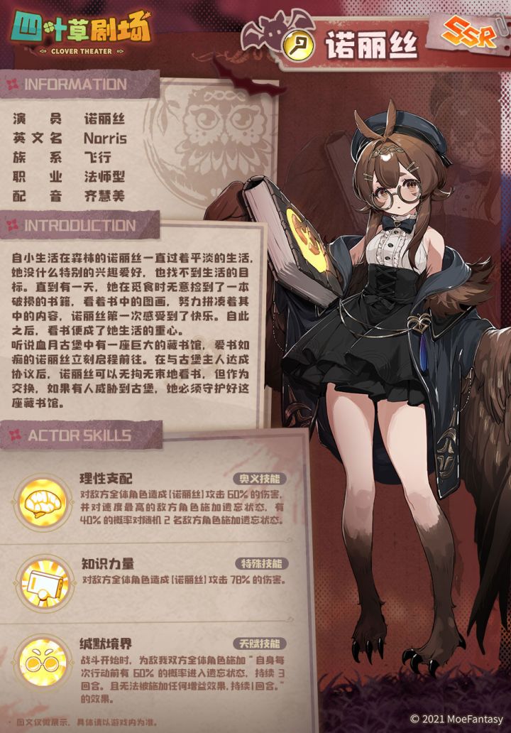 稀有度:SSR自小生活在森林的诺丽丝一直过着平淡的生活,她没什么特别的兴趣爱好,也找不到生活的目标。直到有一天,她在觅食时无意捡到了一本破损的书籍,看着书中的图画,努力拼凑着其中的内容,诺丽丝第一次感受到了快乐。自此之后,看书便成了她生活的重心。听说血月古堡中有一座巨大的藏书馆,爱书如痴的诺丽丝立刻启程前往。在与古堡主人达成协议后,诺丽丝可以无拘无束地看书,但作为交换,如果有人威胁到古堡,她必