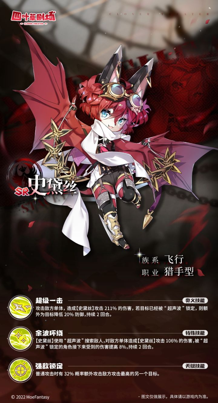 【新演员登记】史黛丝稀有度:SR史黛丝没有亲人,自有记忆起,她就在流浪。被咬不动的面包与漏雨屋檐填充的童年,实在说不上美好。某一年冬天,在饥寒交迫中陷入昏迷的她,还以为自己再也不会醒来,却没想到睁开眼时,身上盖着从未感受过的温暖棉被,空气中还有阵阵食物香气。收养她的是一位猫又武士,在这里,她学会了使用自己的身体进行战斗,利用自己的优势谋生。幼年的流浪经历让史黛丝深知生存不易,也许史黛丝自己都