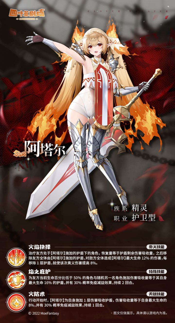 【新演员登记】阿塔尔稀有度:SSR阿塔尔是来自与艾德文娜相同部族的、精通火元素魔法的精灵族。与艾德文娜不同,阿塔尔出于自身意愿,在部族长老们的支持下外出历练并成为冒险者。而阿塔尔成为冒险者的第一个任务便是讨伐食人巨妖,这也成为她定居地下城的起因。原本习惯了在地下城生活的阿塔尔,在某天遇见名为四叶草剧场的一行人,在共同经历过冒险之后,离开地下城并且加入了剧团。只是让她没想到的是,已然成为精灵
