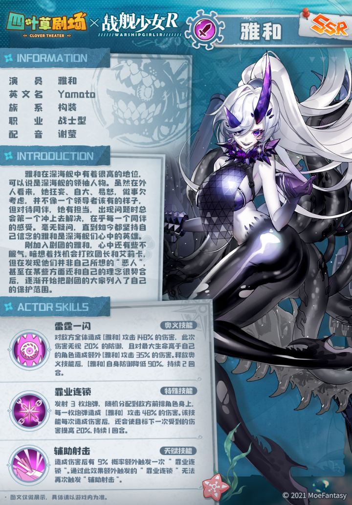 稀有度:SSR雅和在深海舰中有着很高的地位,可以说是深海舰的领袖人物。虽然在外人看来,她狂妄、自大、易怒,做事欠考虑,并不像一个领导者该有的样子,但对待同伴,她有担当,出现问题时总会第一个冲上去解决,在乎每一个同伴的感受。毫无疑问,直到如今都坚持自己信念的雅和是深海舰们心中的英雄。刚加入剧团的雅和,心中还有些不服气,暗想着找机会打败团长和艾莉卡,但在发现他们并非自己所想的“恶人”,甚至在某些方