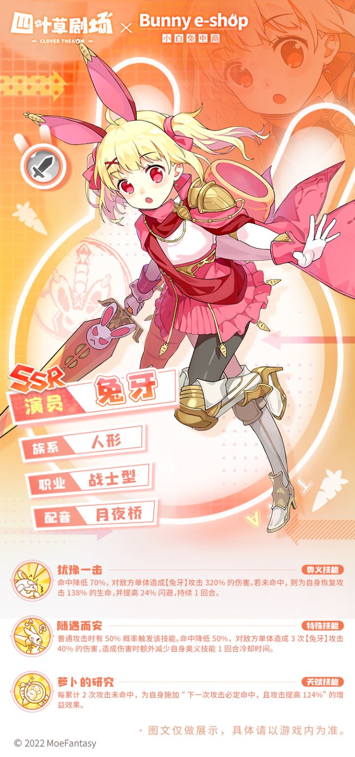 【联动限定SSR演员】兔牙兔牙非常喜欢萝卜,所有跟萝卜相关的事情都可以引起她的兴趣。居住在东边的兔子村的她开了一家小小的的网店,卖起了萝卜。不过比起赚钱,她有着更加质朴的愿望——将村里种的萝卜推广出去,让更多人吃到她们种的萝卜!来到索米尼亚大陆后,兔牙依旧在开开心心地研究她的萝卜,尝试做出更多美味营养的萝卜料理。或许也会遇到新的难题吧,但如果是兔牙的话,一定没关系的~《四叶草剧场》×《小白兔