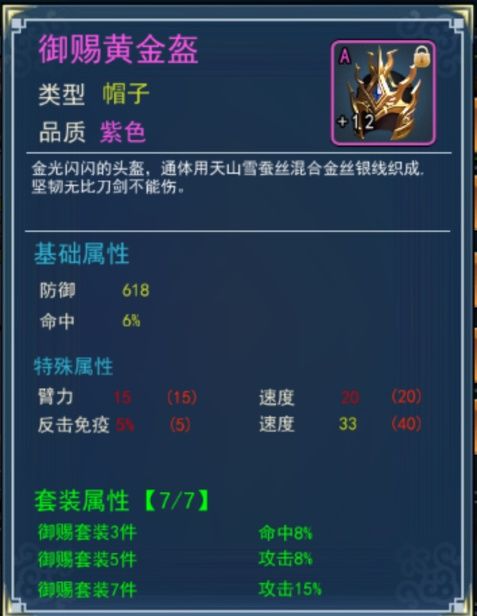 御赐套装分析:六扇门出御赐套装,A级套装,总7件!套装属性是:①3件加8%命中②5件加8%攻击③7件加15%攻击也是目前为止,游戏中的唯一成套的套,虽然有点肝,但总归都会有的,值得研究!套装如下:从套装属性可以看出,是攻击职业套装,拳就不用考虑,刀和剑可以一用。刀暴击爆伤最牛,大家都把最好的装备给刀了,所以身为A的套装也不是很适合刀。剑一般都有两个,一个主剑,一个副剑!御赐套装