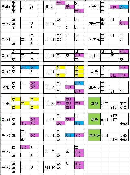 战力不够,115万勉强过点星山,死来死去搞了1小时零4分钟。黄色是反震几率超高的,蓝色是打2,紫色是打3。本人阵型只是给自己记录的,每个人攻击防御都不一样,摸索着调整吧。如果谷墨打得过就直接拿了炮弹去打月卫,不用打第二批星兵了。
