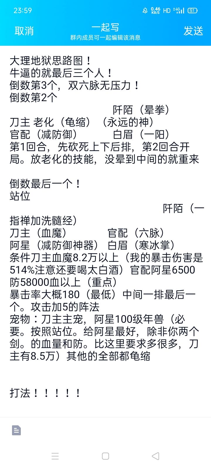 首先庆祝一下成佛塔地狱过了还没过襄阳地狱我的话其实就是一个能抗下路前排和第二位打两次(也就是第三回合我方第二排的副拳才被摸到),同理副拳,以及能抗上路前排一下的剑主。属性如图,刀要在拳之前出手并且拳(最好两个都)在对面上路后排出手前出手(大概是1900的速度,下图为错误示范,不用2000,),下面为属性图(具体可以存档或home一下试试,满足上述需求即可)首图战力为调整完毕的战力,平时战力为47