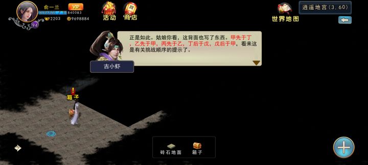 完成无双小会(无双山庄叶慕舟触发)之后,去长安醉仙楼找到古小虾对话,然后去逍遥派童宫主对话,接下三掌,需要消耗200真气,150000阅历,随后在程清衣(不知道是不是这个,站宫殿外的那个)进入地宫,依次打败丙,乙,甲,戊,丁机器人,然后通过三场比试考验,古小虾入队。