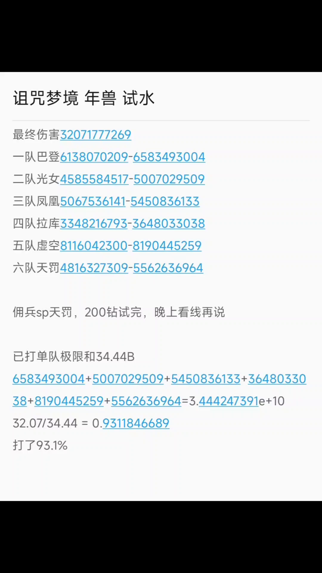 诅咒梦境 年兽32B(极限34.44B)无sp女王试用