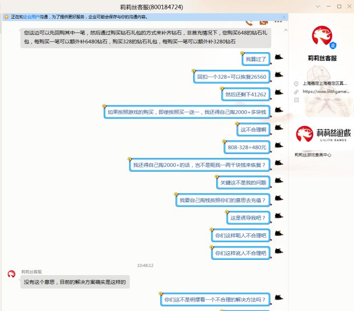 事情发生在昨晚,我发现游戏钻石显示负数,然后发现苹果IP被登录,然后联系了客服,也打了电话,结果只收到了无止境的充值安排,目的就是让我自己花钱买回损失的钻石。而且一直把责任怪在苹果那边,苹果都已经尽力了,然后客服一直劝我回购(只能一次),剩下的自己花钱去购买。我昨晚到今天一直联系看看怎么补救,客服大爷们就只会叫我充钱,我已经投诉到了12315那边了,各大无辜受害者要提前预防莉莉丝的潜规则。