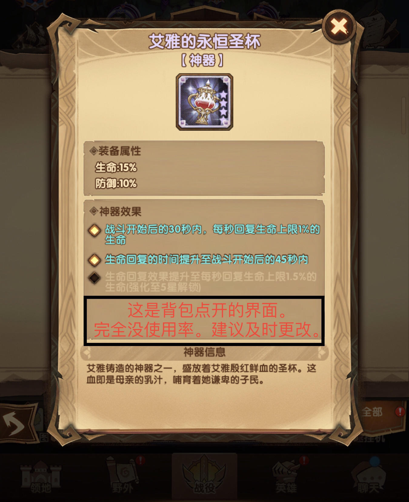 【标题醒目。 策划才看得到 】第 一 : 首先第一个问题。背包🎒。背包里的神器点击开只有简单介绍。纯属浪费啊。强化神器和更改使用情况。居然还要一个一个英雄看。要么就是凭记忆和使用情况去找。点击背包里面的神器也能出现英雄界面点开的使用界面。(具体看图)第二 :背包🎒里面的垃圾装备实在太多。。。。完全没有金币强化。。。极度缺金币。。。所以添加一键售卖功能。。。把背包🎒里的垃圾装备售卖成金币。。。