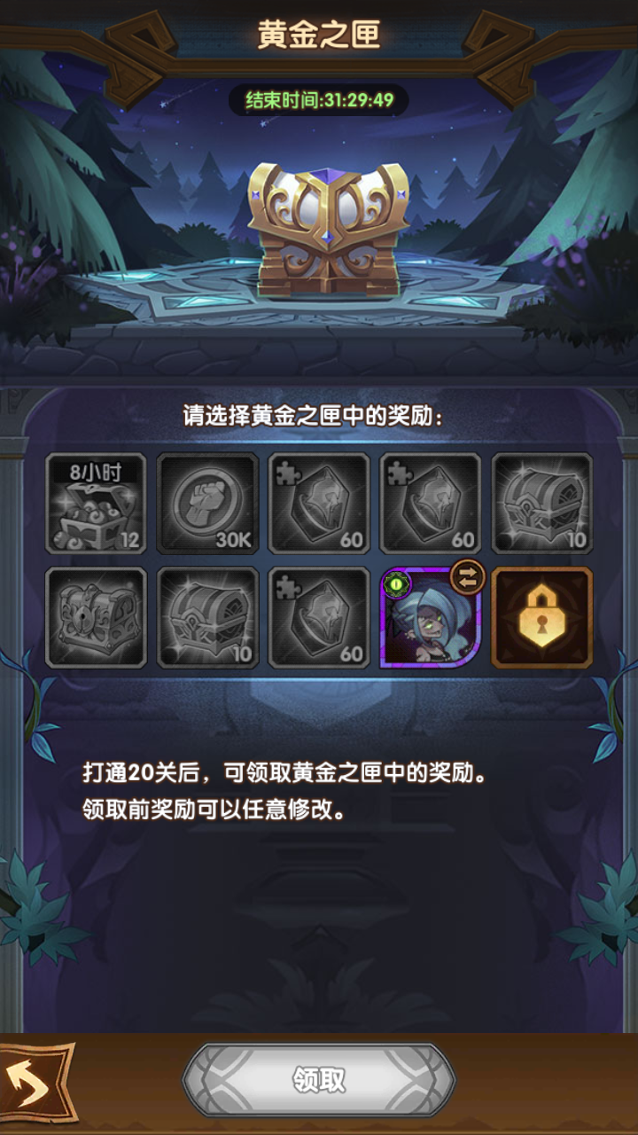 这个英雄自选箱不让领了,就是因为以前我领过,8月30号的晚上12点左右我打通了29章,这个过关条件就改成了打通30章20关了。活动时间还没过去,能随便改过关条件吗?还有信用可言吗?如果是bug的话,希望莉莉丝赶紧补偿,我们公会的几个人都热情高涨的过关,我过去了,得到的是一盆冷水,心拔凉拔凉的