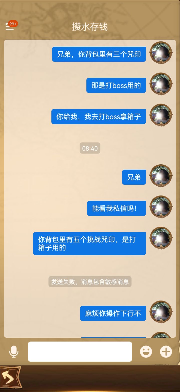 官方出来看看,这种消极游戏摆烂的怎么处理?背包里五个咒印,一次不打,也不放进公共背包。说实话这种一看就是小号,上线五分钟就撤了。一个很简单的功能,咒印多于两个,或者超过48小时没有使用的自动存入背包,这都不会做?真的,如果你们不会做这种需要合作的活动就别做。
