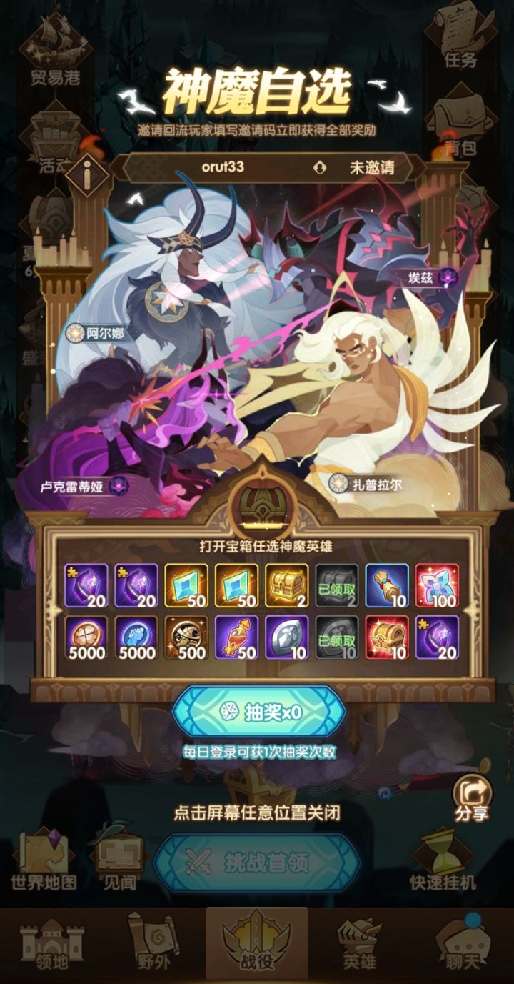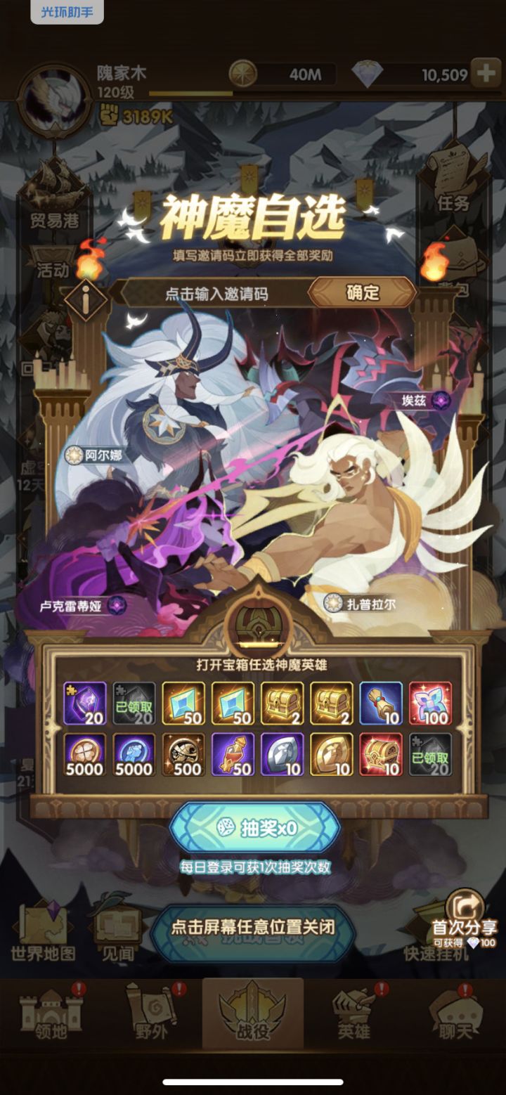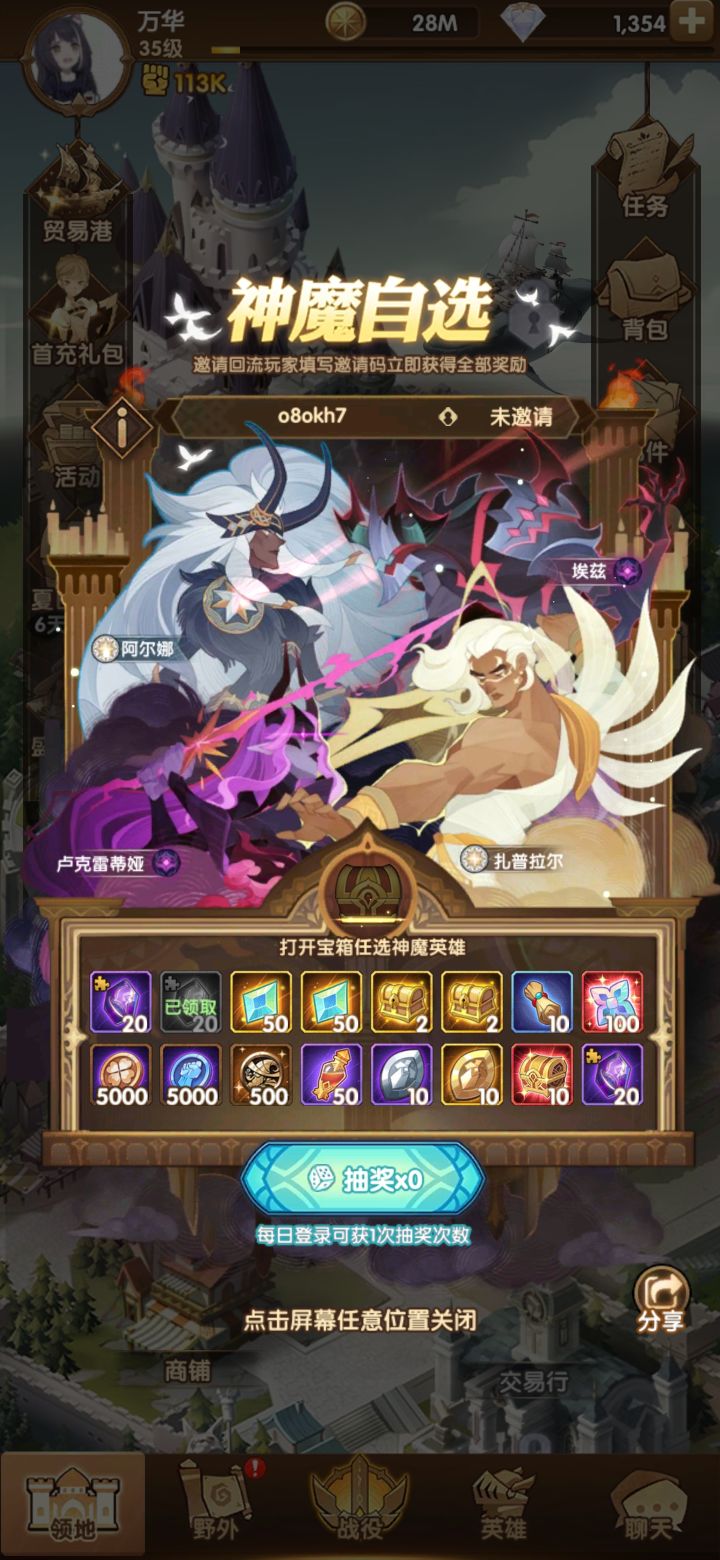 复制自某大佬:回流玩家请注意,进入游戏界面后点击左边活动菜单,往下看有一个活动叫 夏日重聚 ,跳出来可以填邀请码,填好双方各得全部奖励和一个神魔自选箱子。 目前神魔自选,任然优先白双子,其次凤凰,活动送的占星越来越多,占星概率也比以前好很多了,白两个神魔完全可行,回流的朋友有什么其他疑问可以在此帖子下留言,我看到了都会一一回复。 最后回流的朋友填邀请码的时候麻烦点点欧皇小手,填写邀请码 c05dx