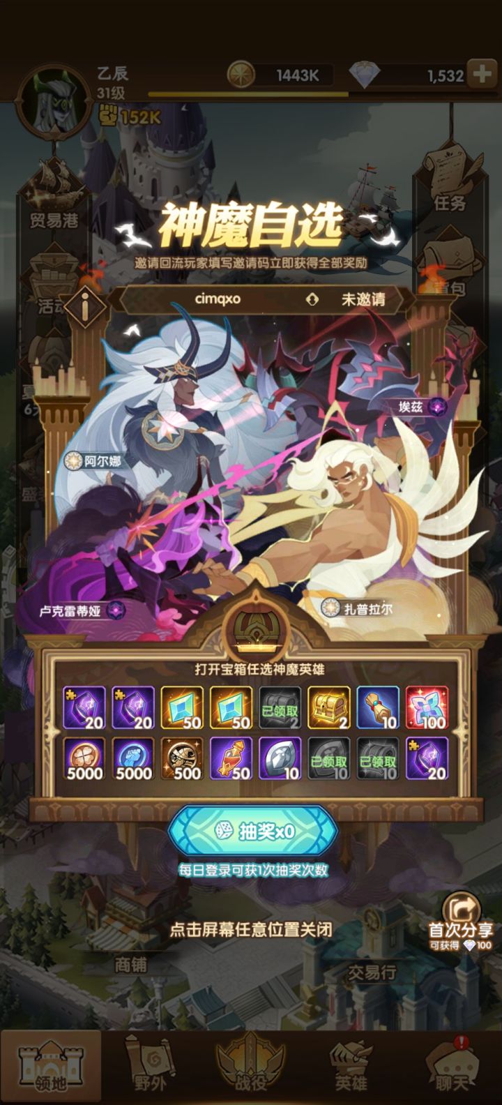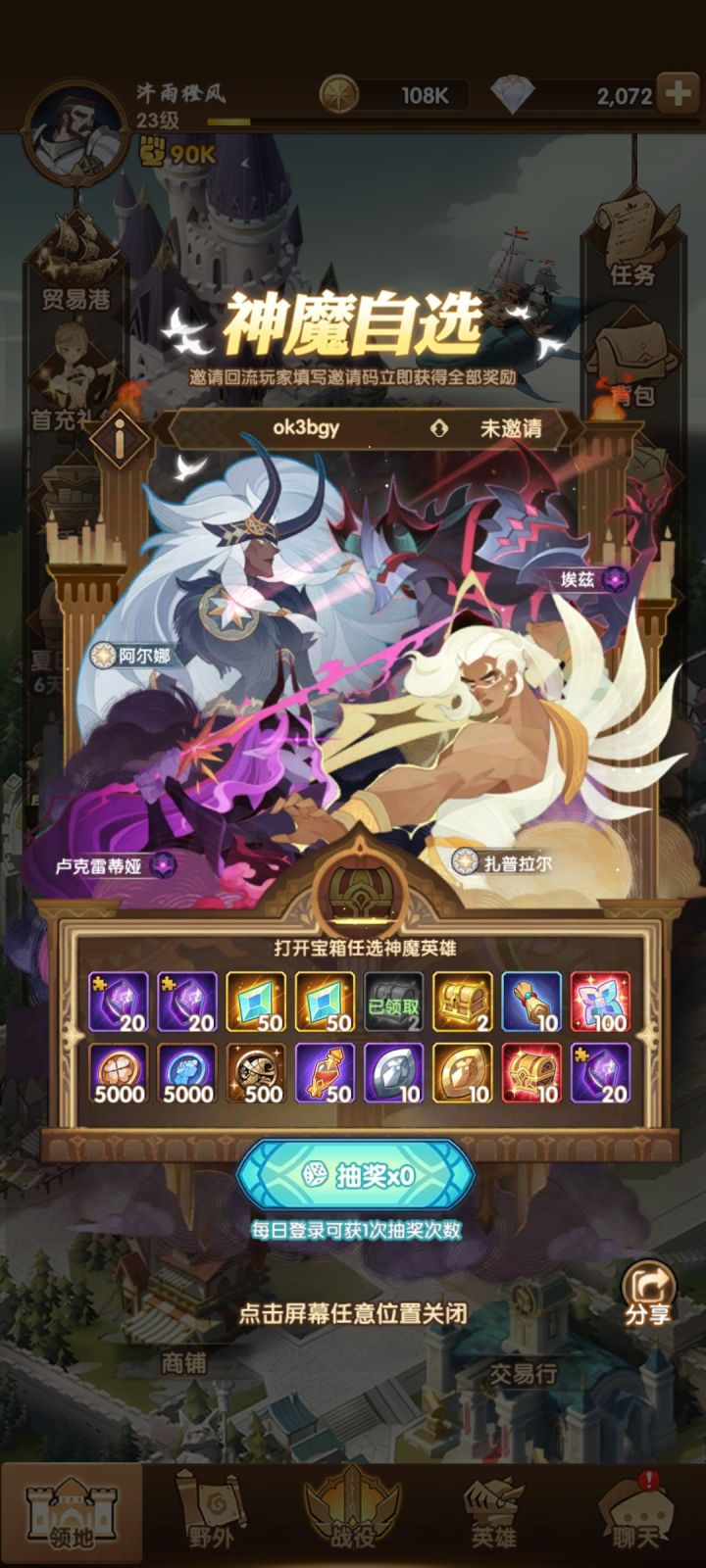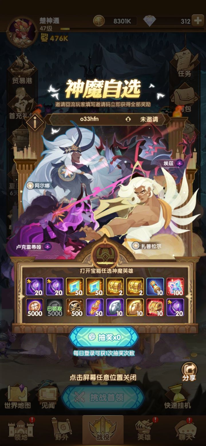 复制自某大佬:回流玩家请注意,进入游戏界面后点击左边活动菜单,往下看有一个活动叫 夏日重聚 ,跳出来可以填邀请码,填好双方各得全部奖励和一个神魔自选箱子。 目前神魔自选,任然优先白双子,其次凤凰,活动送的占星越来越多,占星概率也比以前好很多了,白两个神魔完全可行,回流的朋友有什么其他疑问可以在此帖子下留言,我看到了都会一一回复。 最后回流的朋友填邀请码的时候麻烦点点欧皇小手,填写邀请码 c05dx