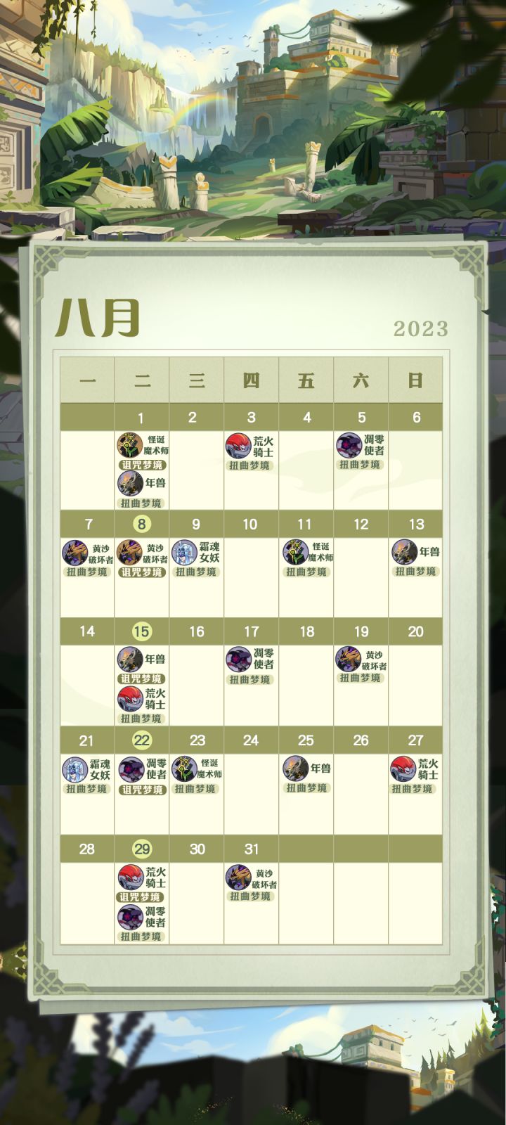 盛夏未尽,忽而立秋八月份的剑与远征专属日历如期而至里面标注了一整个月的梦魇入侵活动BOSS的轮换哦~有了它,妈妈再也不用担心我忘记打BOSS啦!快来领取你的日历吧!