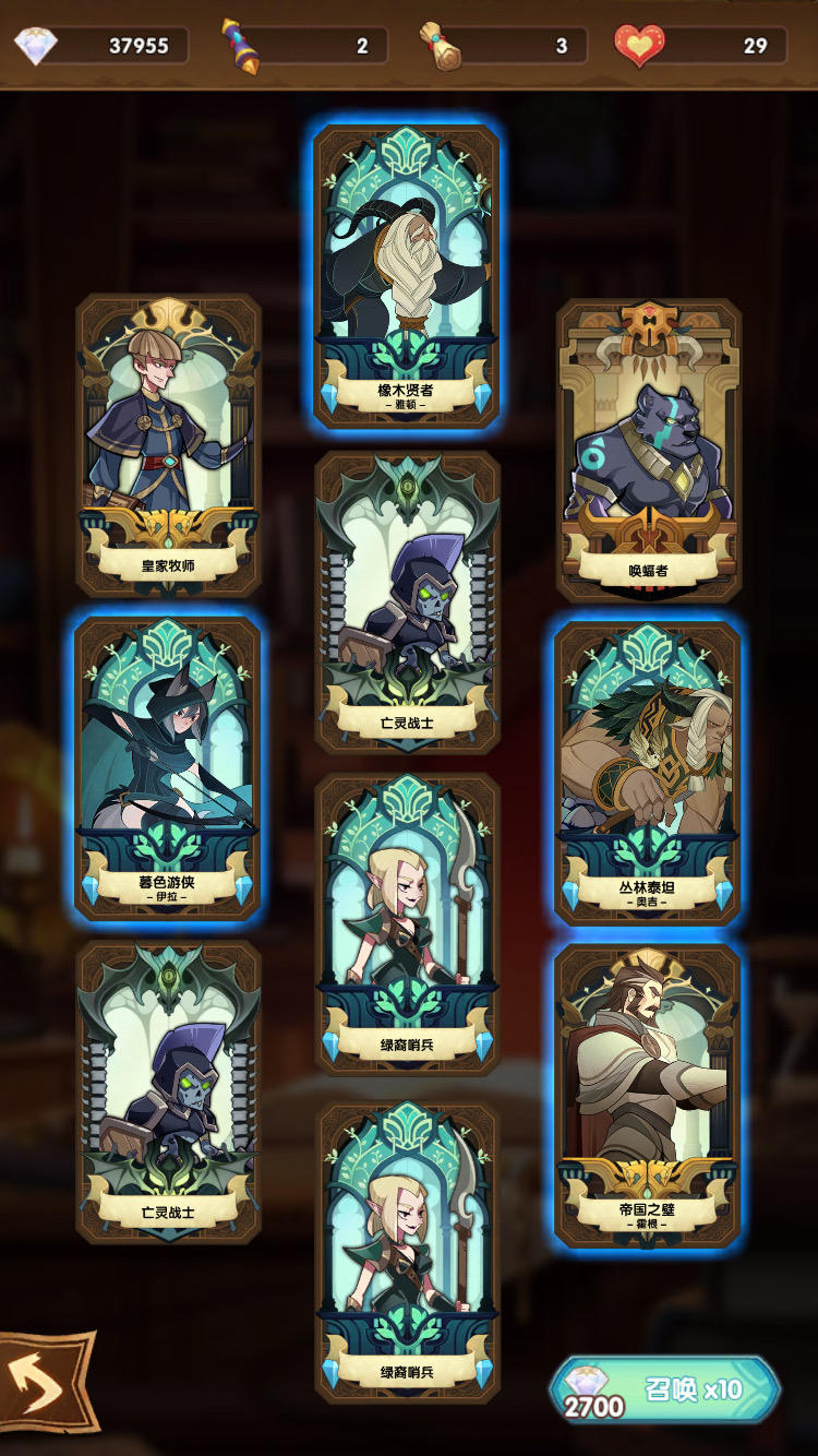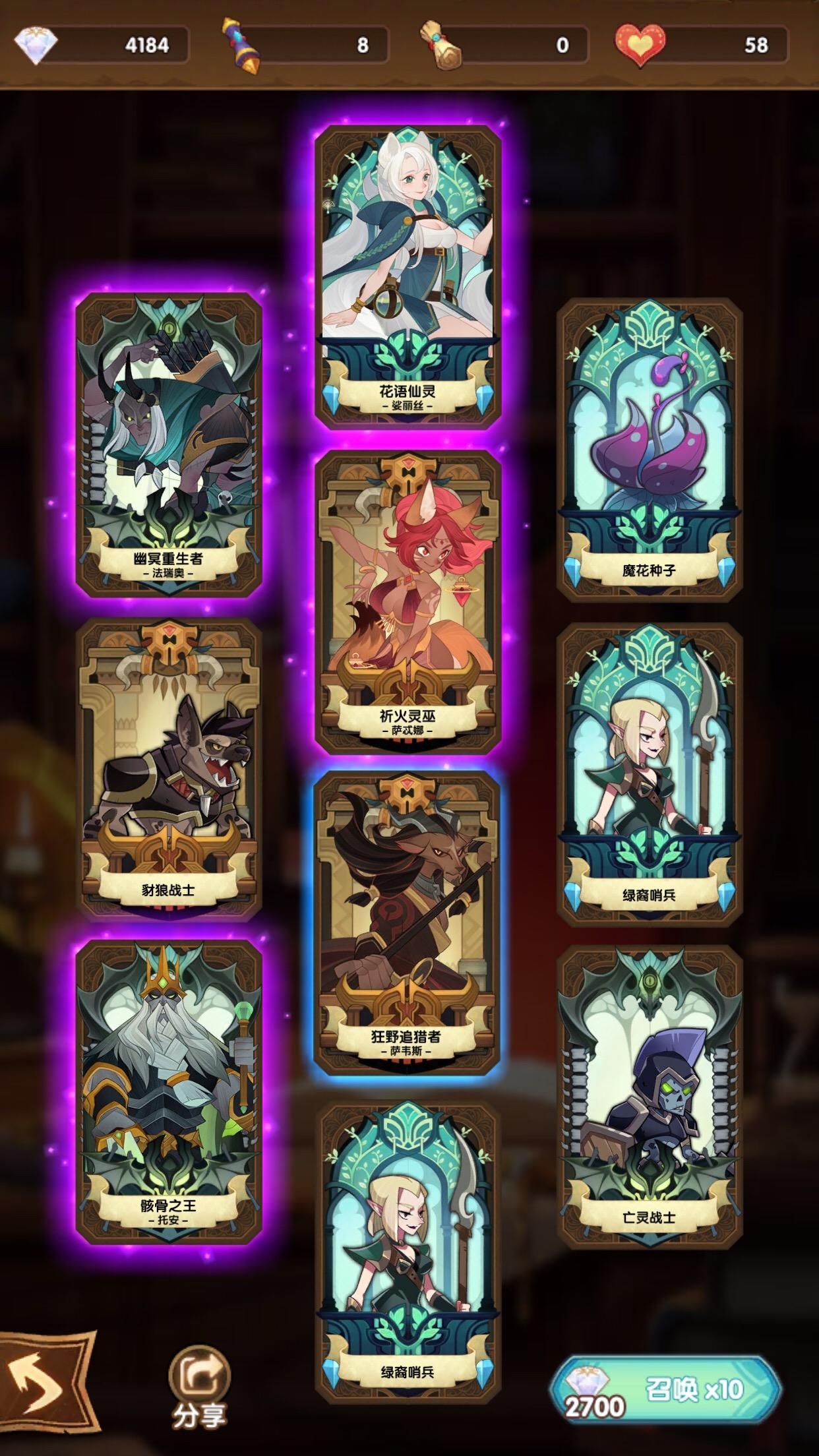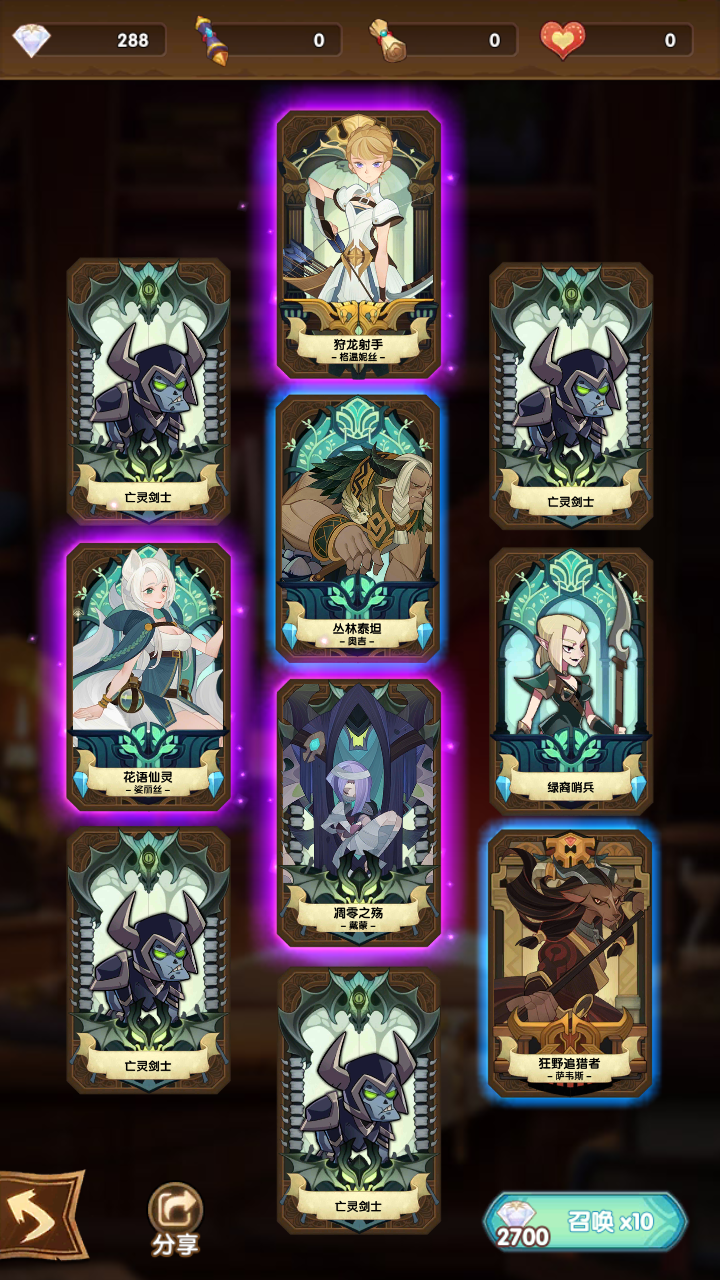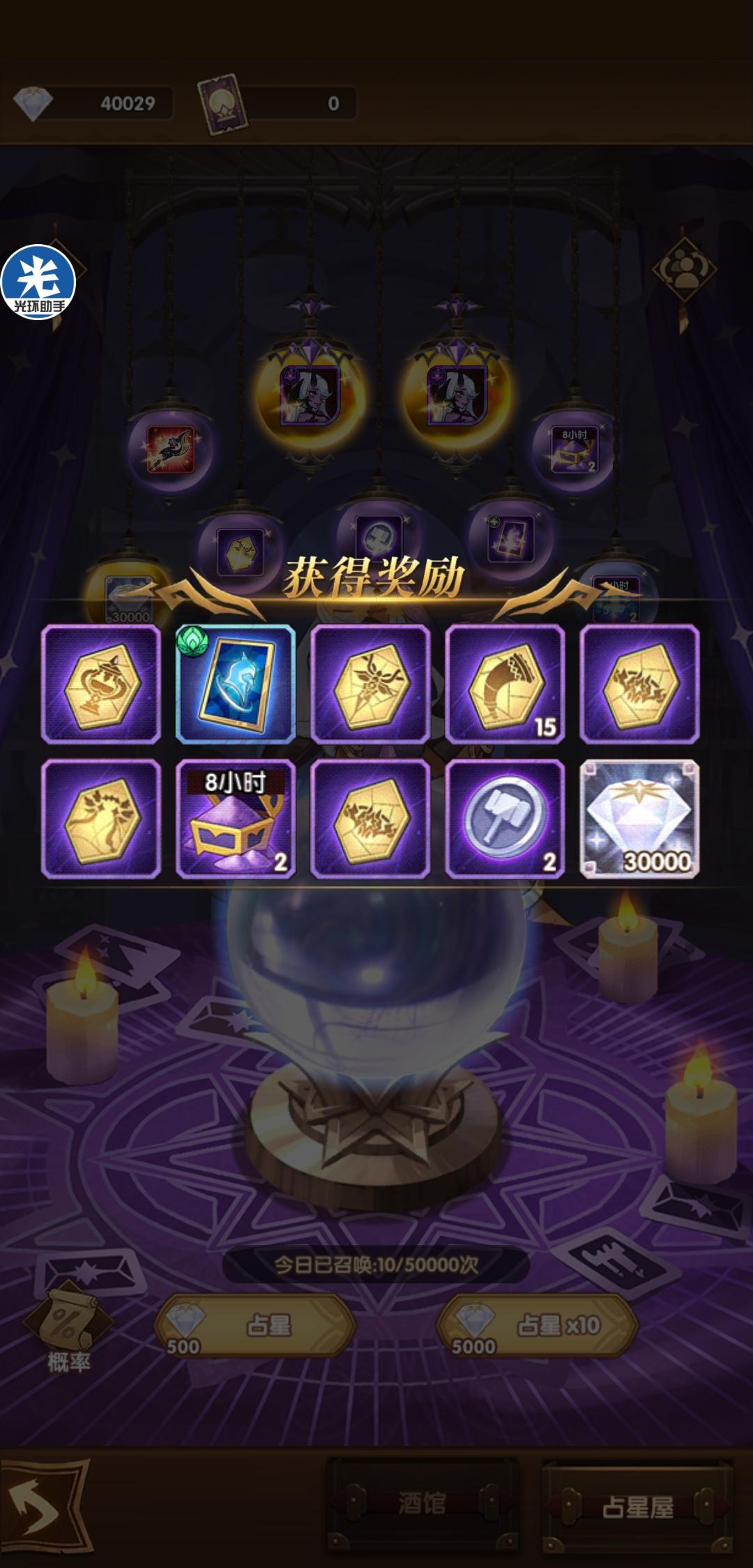 忍不住氪了个128成长基金,无奈卡在28-48,所以就这么多钻,话不多说,开抽总结下,15次十连,抽出来9张紫卡,加上酒馆送的两张,一共11张,全是真紫,感觉还不错送了两个紫卡,选了绿裔
