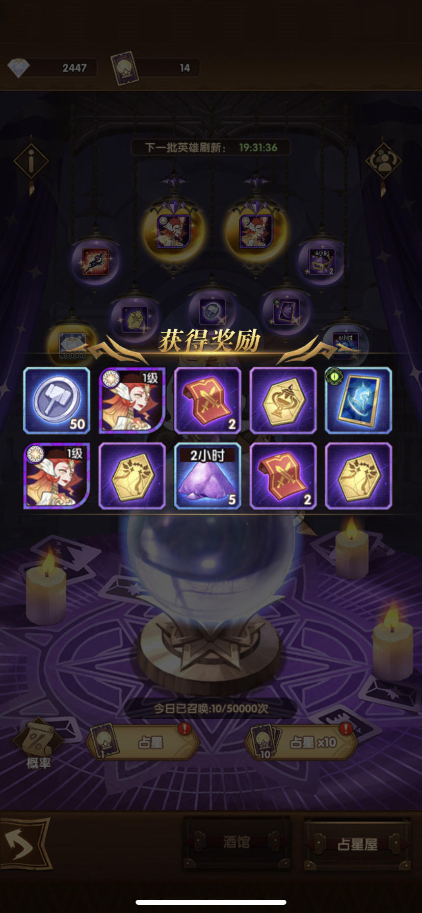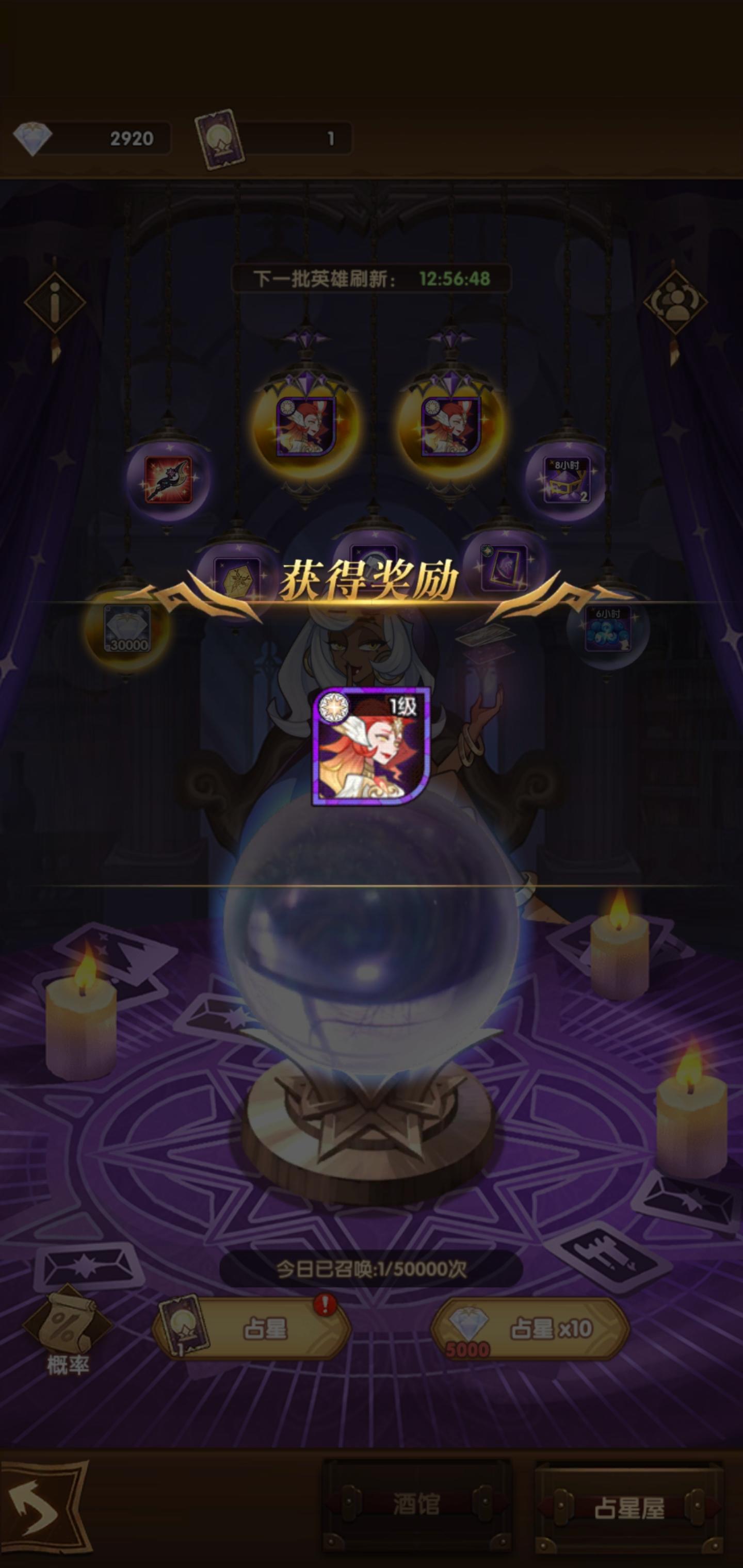 运气有点好嗷,早上7:30醒来,挂机得到的6个钥匙,获得一个占星券,没想到占到了额滴神呀!