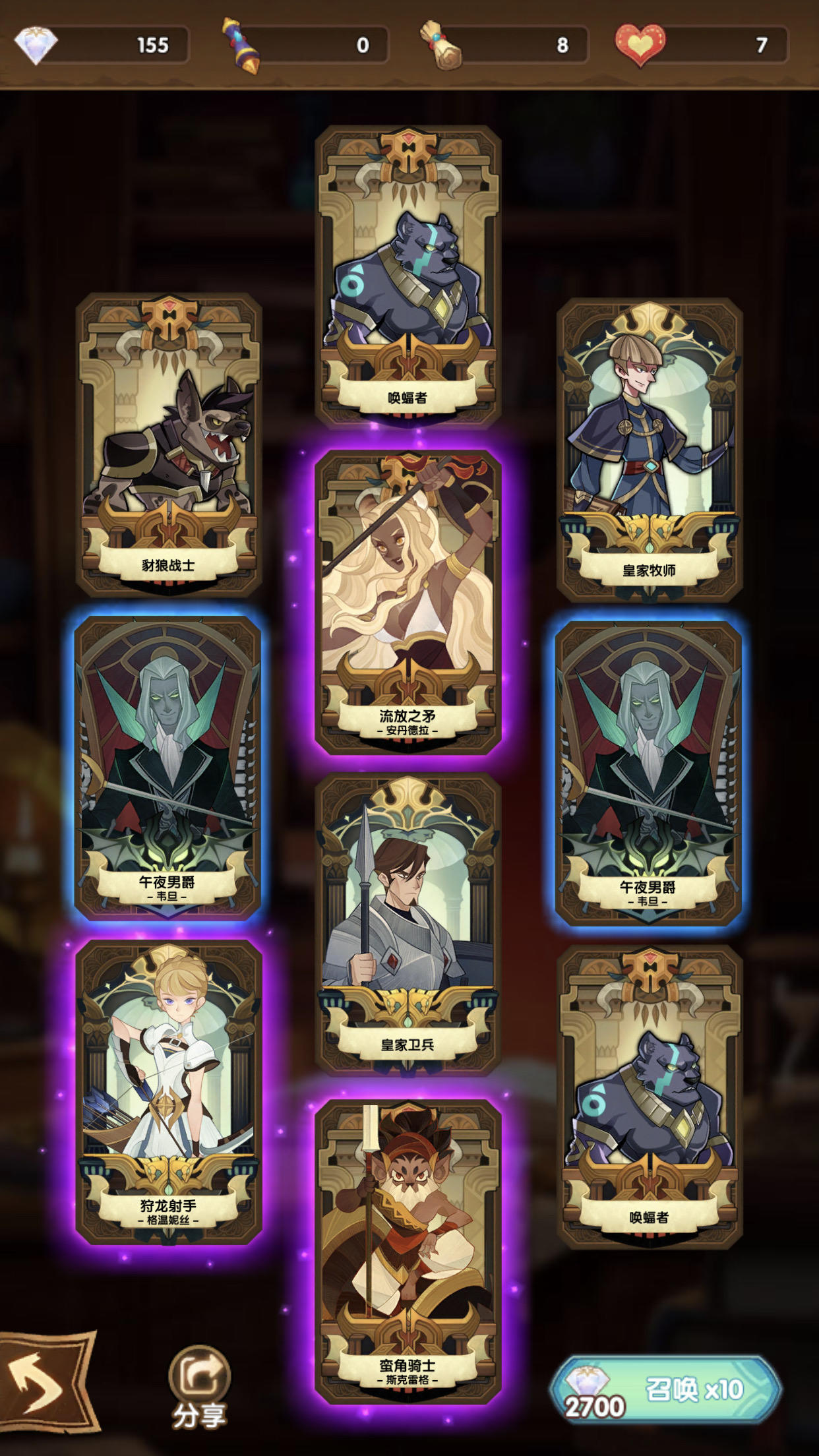 一次三张紫卡,还可以吧!刚玩7天,萌新,啥也不会,多多指教,这个阵容该怎样搭配?打不动了。