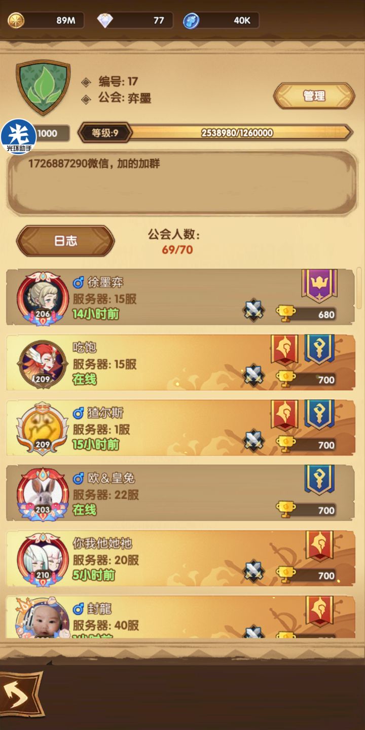满级公会217469招人,工会福利包括:每次梦境,稳定100钻公会奖励;推荐入微信群,鼓励吹水交流游戏各类细节并随时开车,同时群里有多位妹子&男神唱歌。喜静的,建议团本期间入群,方便合作配合,稳定亲王轻松不肝,佛系但全员付出有组织有纪律。欢迎活跃玩家加入,要求32章➕,团本态度端正,关注各节点工会通知,按时间节点铺路、断路,7、8级任务城,最后阶段公会组织全员完成。每阶段自觉铺3-5格,只打城不