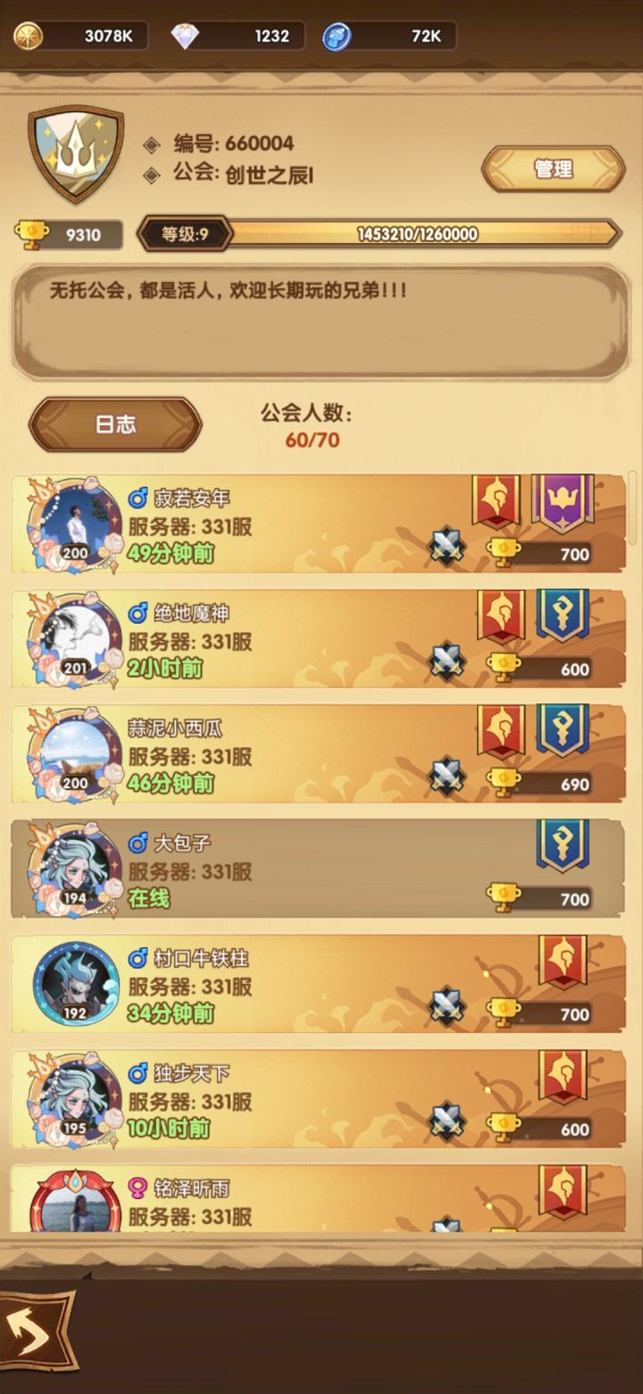 四百八十万10级公会诚招(12章以上长期玩家)福利有《鲫鱼》极域梦境2天1次的100钻,五星白卡佣兵,有爱亲王。良好的沟通氛围,长期相伴