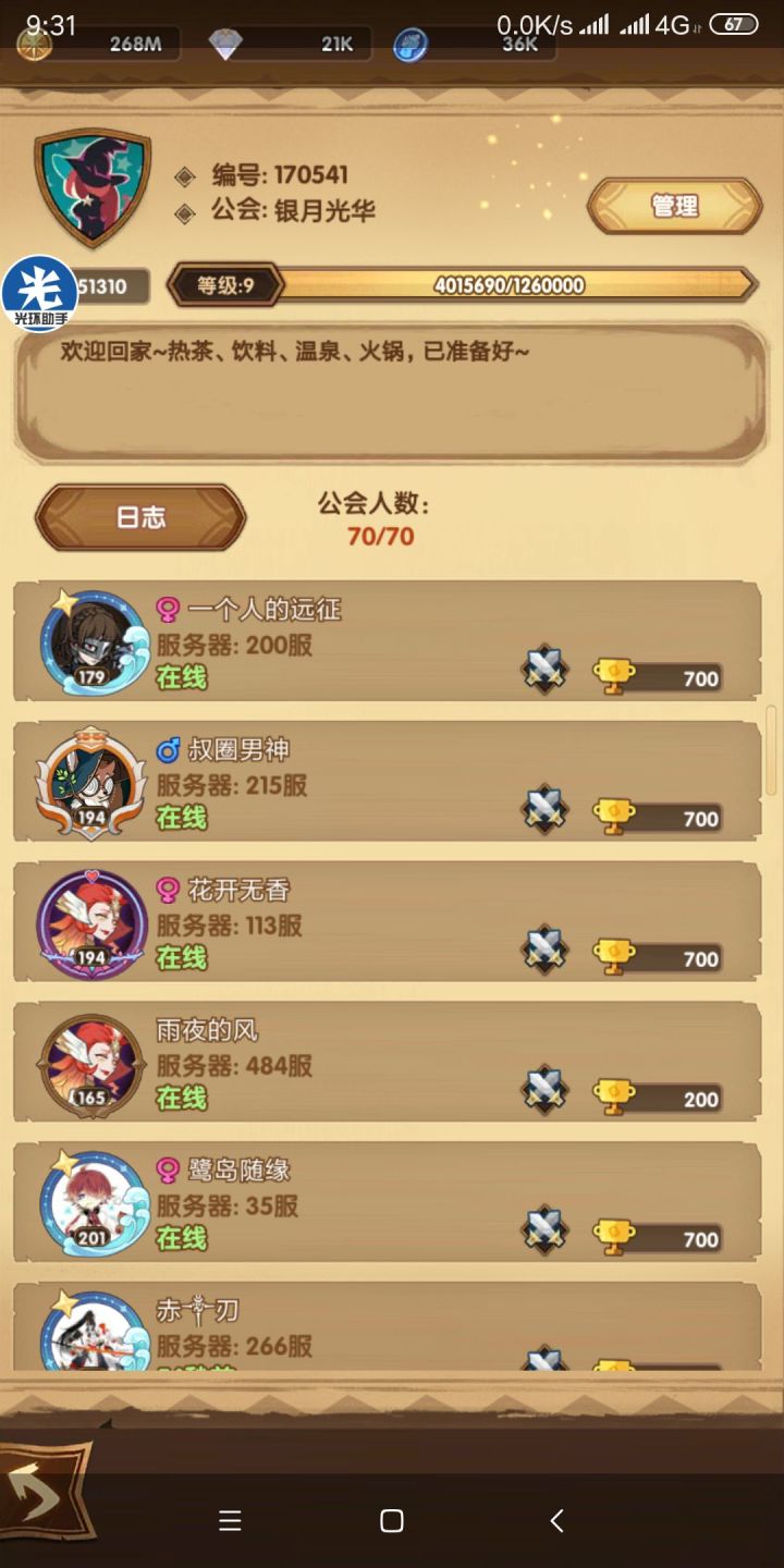 9级会 马上满级了因本人最近太忙了 公会有些疏于管理招募一些小伙伴一起玩!公会有微信群!有很多可爱的小姐姐!有愿意进来当个副会啊什么的也可以!休闲养老!不肝不氪!别问!问就是零氪!欢迎加入呀!有活跃负责的会来合一个会也可以!公会ID:202988 等月色温柔!