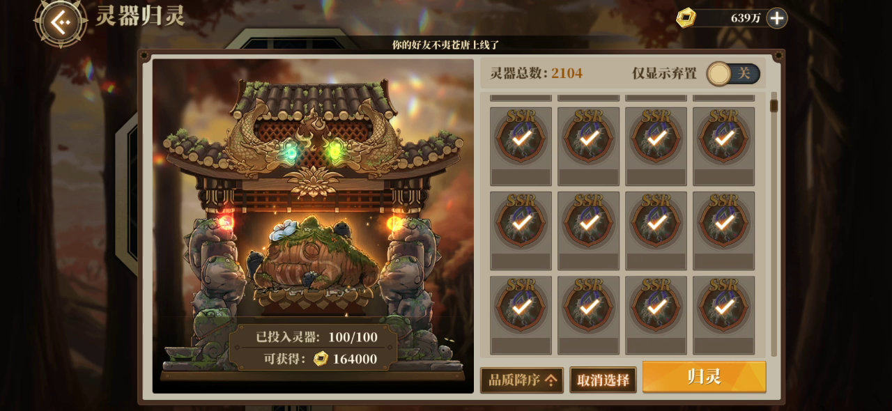 一次归灵一百个SSR灵器会给什么