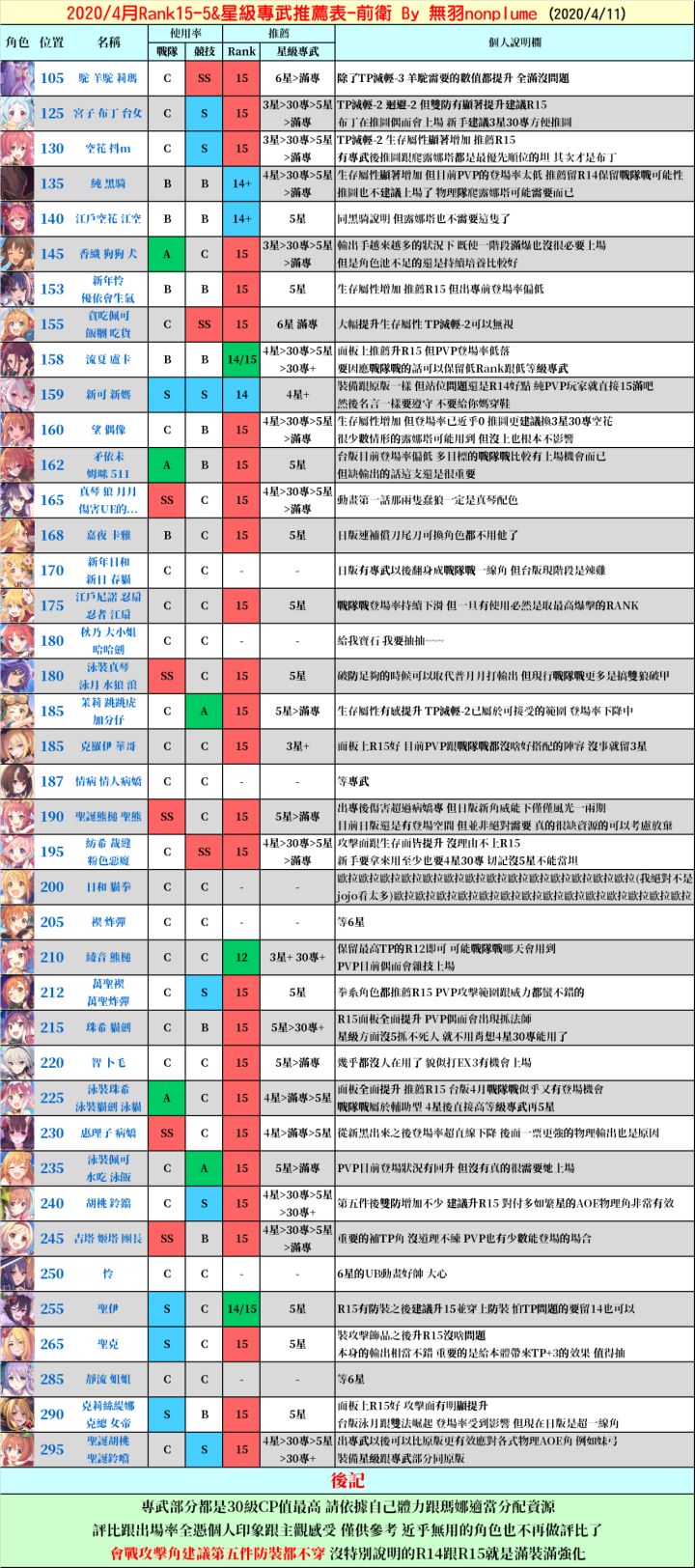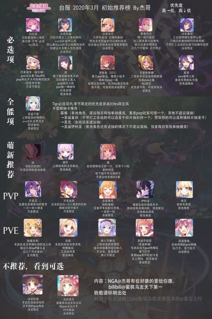 萌新们注意角色并不是rank拉满最好,部分角色也不是星级越高越好,典型的有新年优衣跟泳装咲恋,最好三星;推荐如上————————————————————————————————好像还有人看这个帖子,更新到了四月份的。每个月开放等级上限及rank都会有更新,只是到时候看我记不记得搬运了。另外说一句,这个也只是参考,升过头的绝对不要就以为崩了,肯定能用,当然如果没升到顶的参考这个也不错,还可以省材