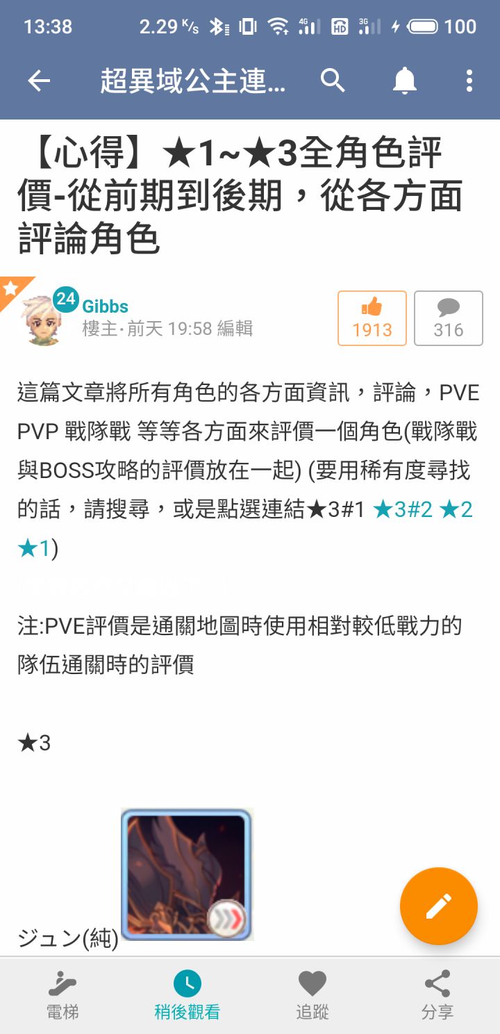 看到论坛大多都是问怎么配队,该练谁的问题,我给大家转一个来自巴哈姆特论坛的网址,里面有大佬对全角色的详细评价,看完包懂。另外,里面的全角色评价是会随着版本活动进行更新的哟~网址为了方便大家复制就放一楼了。PS:浏览次数这么多连个赞都不愿意给吗?心寒