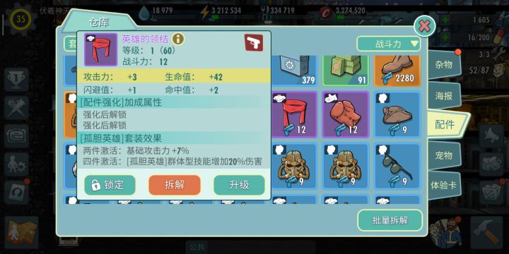 新配件套装-“孤胆英雄”解析 新版本到来了,我们迎来了新的配件套装,今天我将为大家讲解一下,新的配件套装“孤胆英雄”的属性及使用方法。“孤胆英雄”套装,是一套猎手套装,目前只能通过配件工厂合成产出,其套装效果为增加群体型技能伤害20%,也就是AOE伤害增加20%,这个效果是可以和莎拉的破甲重叠的,AOE伤害提高近50%。同时,因为现在竞技场居里套大量出现,所以导致目前莎拉的破甲经常被驱散,而让