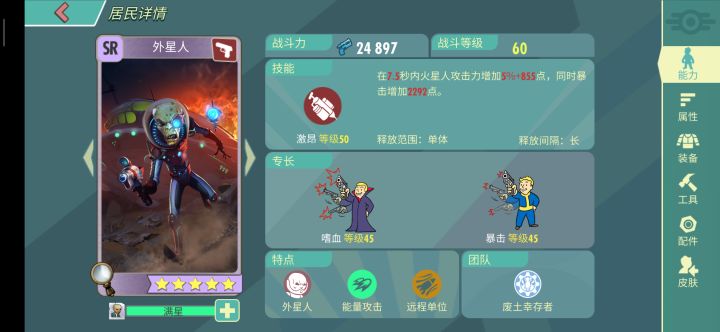 新手玩家开始时没有强力英雄一定会为了选择什么输出感到发愁今天我来给大家介绍一下sr紫卡外星人卡片等级 sr定位 射手所属阵容 废土输出方式 能量输出外星人在种族方面有着巨大的优势 可以再刷图时减免50%的辐射技能方面在7.5秒内增加外星人的攻击同时增加暴击小技能嗜血攻击敌人回复伤害的8%+1721点生命这样能大大加强外星人的生存能力二号小技能增加暴击这样我们可以走暴击路线的外星人走