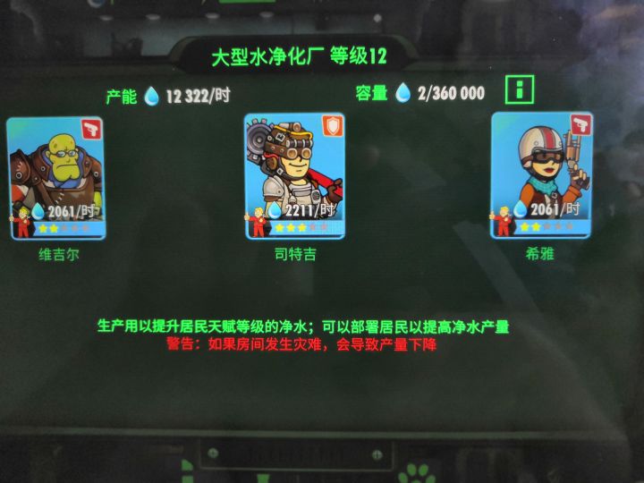 在辐射得世界里日常发展我四种资源,分别是水,点,食物与瓶盖,四种资源的获取不尽相同,但如何使我们每天所获的资源最大化,在这里为大家介绍,一些小技巧。————————————————————日常的房间产出,这是我们获取四种资源的主要途径,房间的单位时间产出与下列三四者有关第一,房间的等级通过主控室的提升,也能使房间的等级提升,这是提高产量的最基本手段第二,房间内工作人物首先是需要人物到与