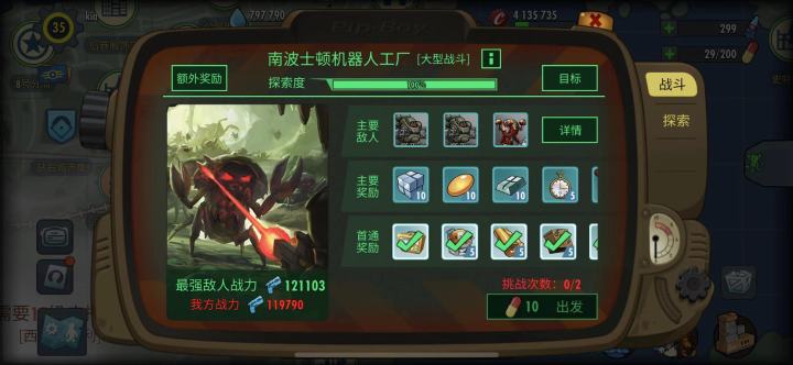 大家一定为了升级材料缺少而烦恼过,现在分享一下材料的积累和获取。一、大型战斗副本10点体力每天2次,收益极高,只要碎片时间就能打完。建议:1、战力高可以不带坦克,带个高血量的李医生即可,留下4个输出位置,推图快2、可以用上公会的支援小人,不但增加自己输出,还可以帮会员拿点瓶盖3、每个副本都有一条最快捷的线路,自己打多了要记下来4、不要以为低级材料没用,当你练新人的时候马上能消耗,所以