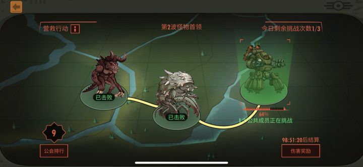 求申请加精华,公会BOSS分为3个怪物,第一个为死爪,第二个为泥沼蟹,第三个为机器人,怎么才能做到打出最大化伤害呢,我们马上来说说。死爪这是一个没有辐射,而且是低战力的怪物,如果你队伍都是50级以上,你可以不带任何医生,轻松过关。最佳伤害阵容:黑人+丹斯+长老+沙拉+凯特泥沼蟹有辐射的怪物,而且伤害还不低,必须带李医生,配合射手黑人或者丹斯都可以。最佳伤害阵容:李医生+丹斯+长老+沙拉