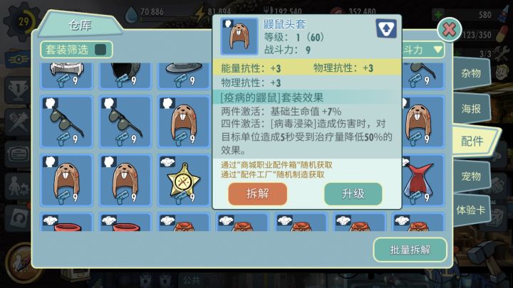 一个满级毕业ssr英雄毕业战力三万左右,配件要占三分之一,其重要性不言而喻。本篇攻略将通过套装配件基础属性分析,伤害测试,实战检测以及适用英雄推荐四个环节对疫病的鼹鼠套装进行详细解读,希望能为广大新老玩家提供帮助。一、配件基础属性分析上图:套装中,帽子与护甲的两条固定属性分别为能抗与物抗,手套提供攻击暴击,鞋子提供生命与闪避。可以看出,整套配件固定词条中,能抗物抗各占两条,攻击、暴击、生命