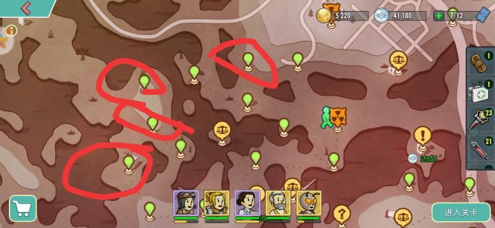 不知不觉,第一批深红商队即将接近尾声(主要是好久没写攻略无聊了,但是又没有奖励没动力)。相信大家都差不多把挑战关卡打完和限定奖励兑换完毕,剩下的300金币兑换1次的紫色材料食之无味,弃之可惜。但是在这里我要给大家一个小提示让大家不肝不快乐。 上图红圈圈住的部分会随机刷新2个问号点,分别为隐秘的仓库5和6,在里面你会遇到辐射狗+红色自爆机器人组合、精英boss、红色宝箱以及神秘商人,这里的神秘商