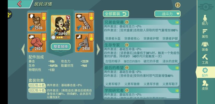 菩提出品,必属精品最近游戏又进行了新一轮的大更新,对于新上线的两个配件,还是很吸引我们的目光的,这两新上线的配件可以说,导致了配件组合的重新洗牌,今天在这里为大家简单的聊一下,废土药剂师对于现有组合的影响,因为楼主也没有使用多久,所以其中的不足之处请大家多多包涵。———————————————————废土药剂师与其他医生类配件一样,上面两件都是加固定双抗的,下面的两件都是攻击与生命的组合这个